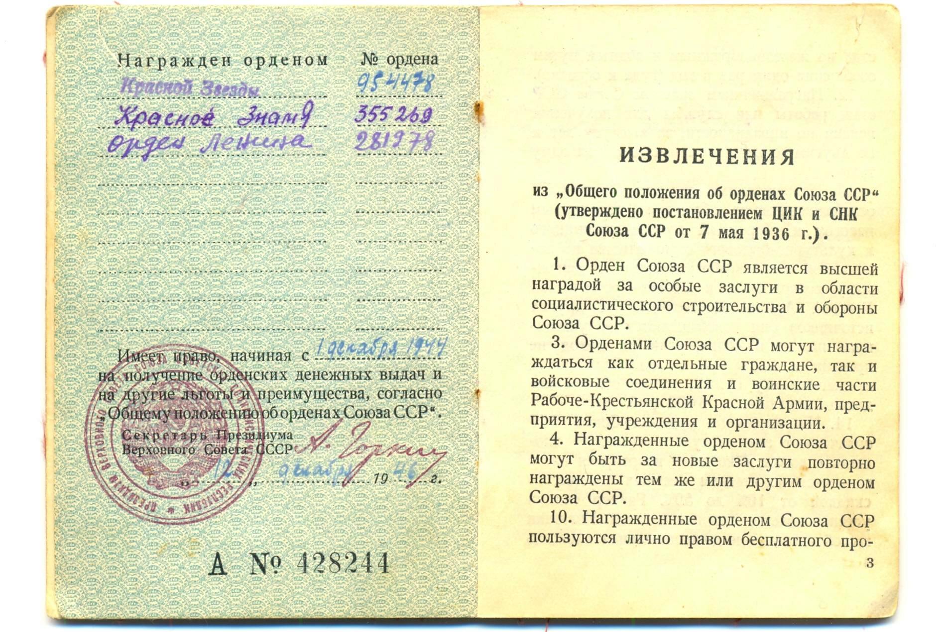 Красного Знамени, Суворова, Кутузова, Богдана Хмельницкого, Александра Невского, Ушакова, Нахимова, Отечественной Войны, Красной Звезды, Славы, За Службу Родине в ВС СССР