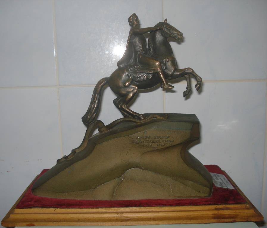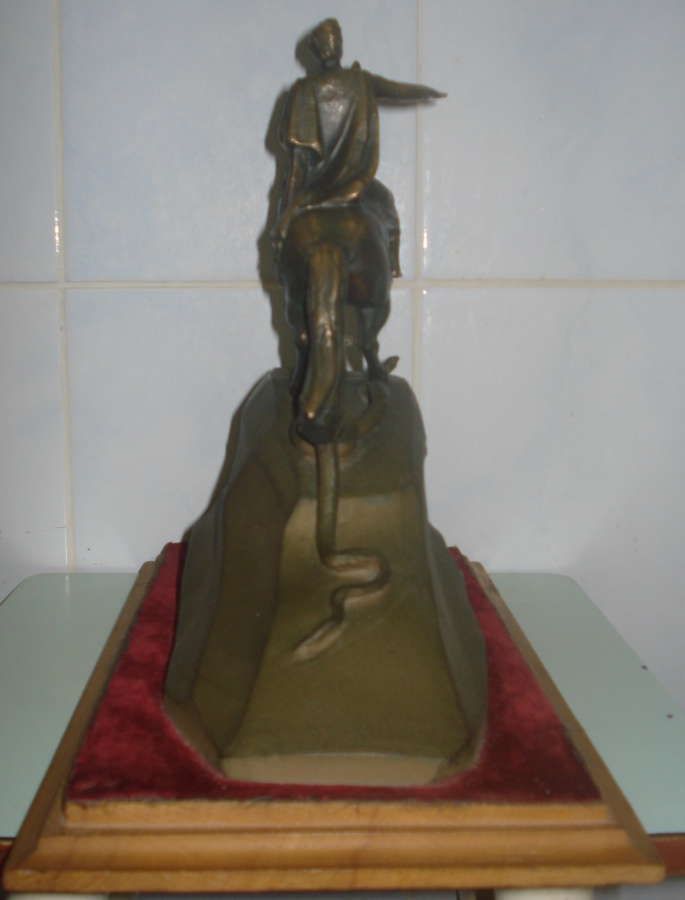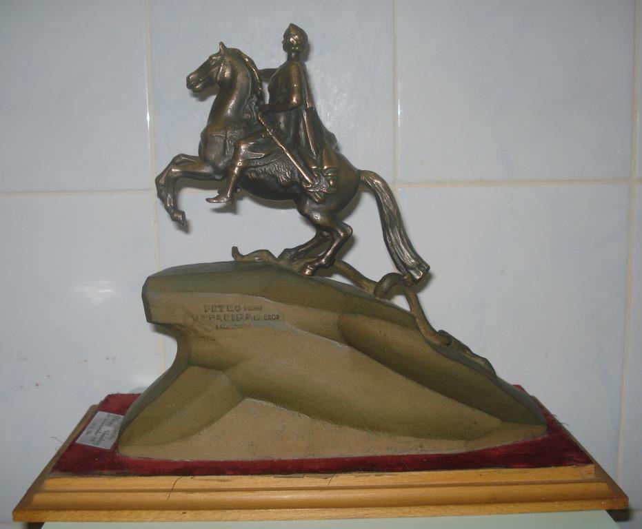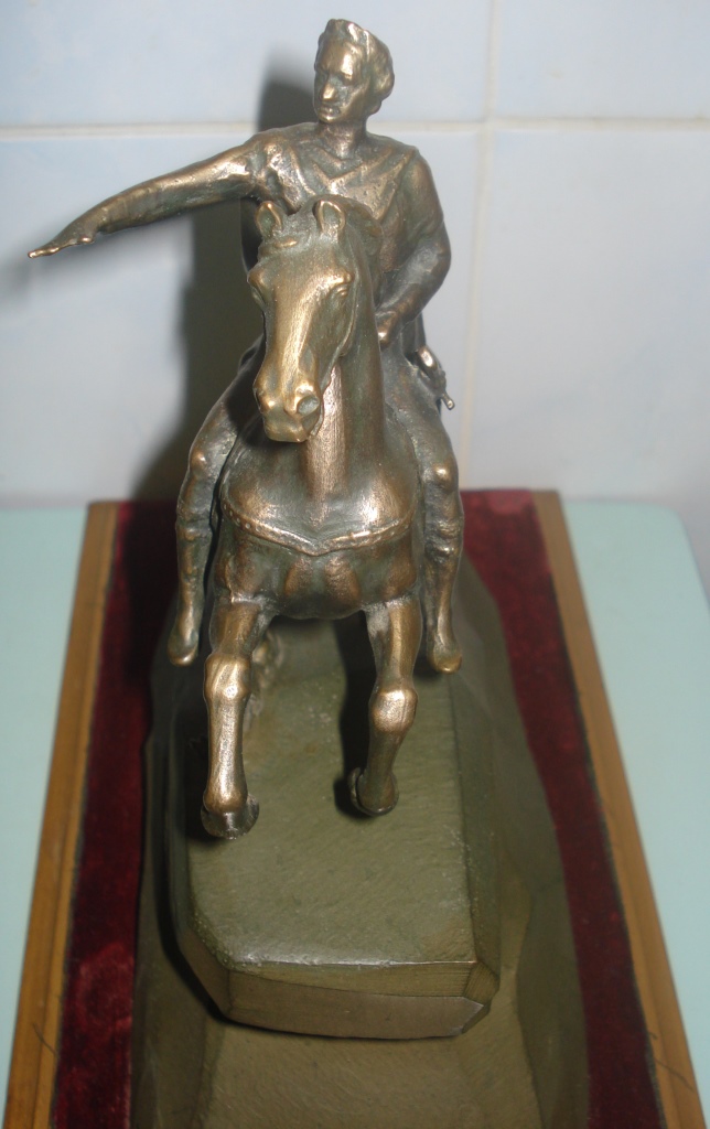 Скульптура крепится к деревянному постаменту с красной бахромой.