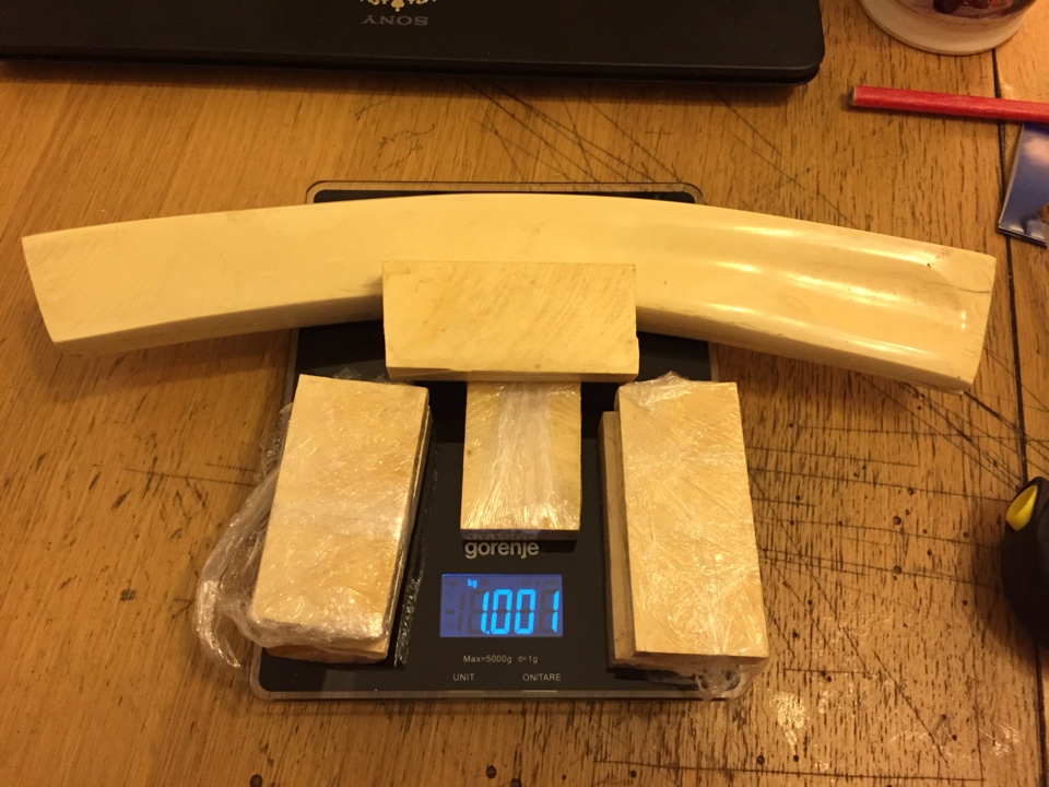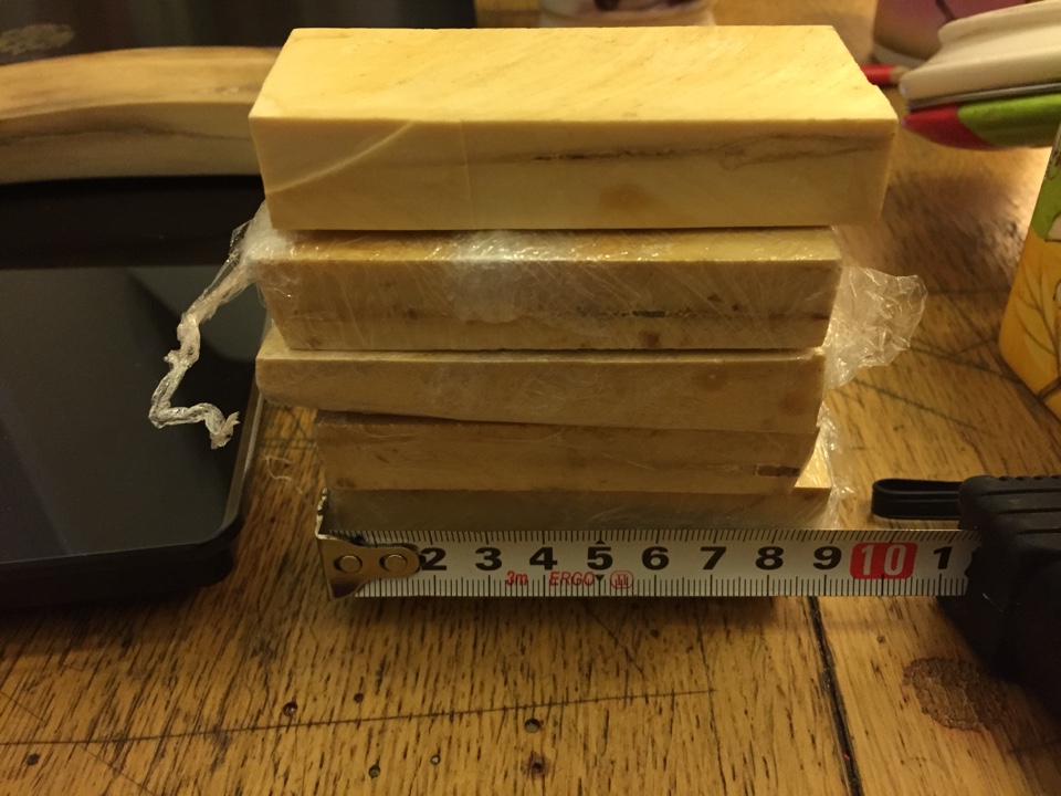Пластины мамонта. Не знаю, под что заготовки были, но почти все куски первого сорта. Белые, ровные. На одном чуточку скошен угол.