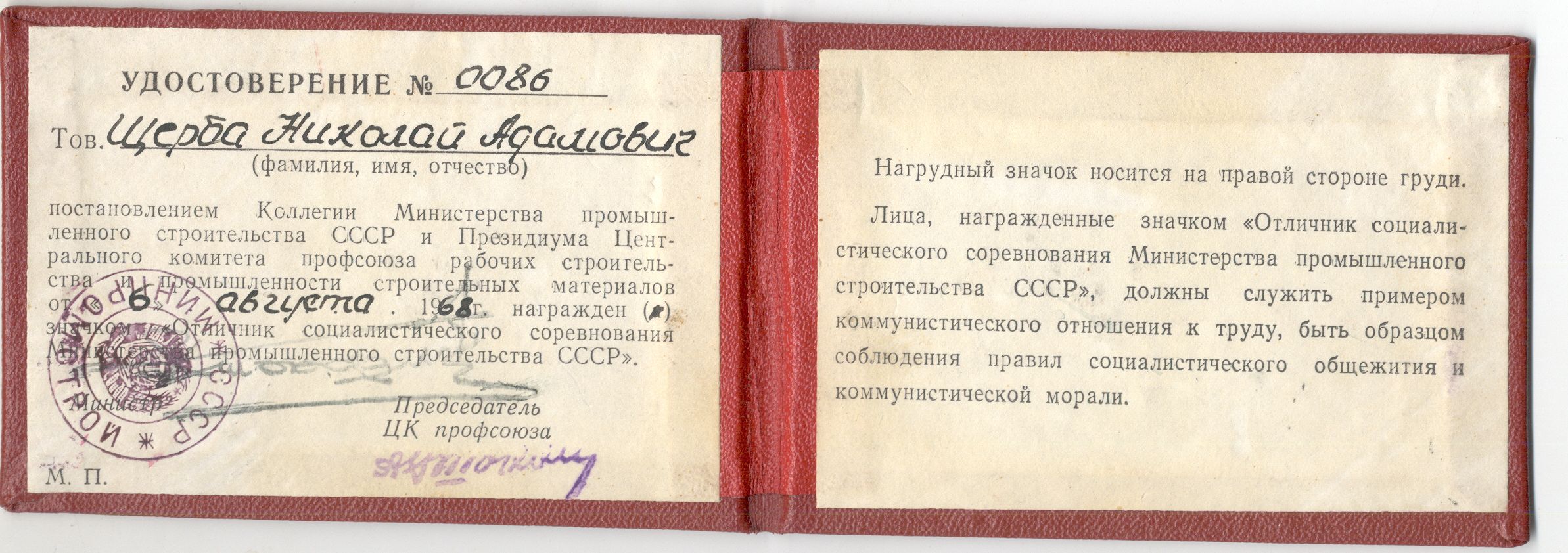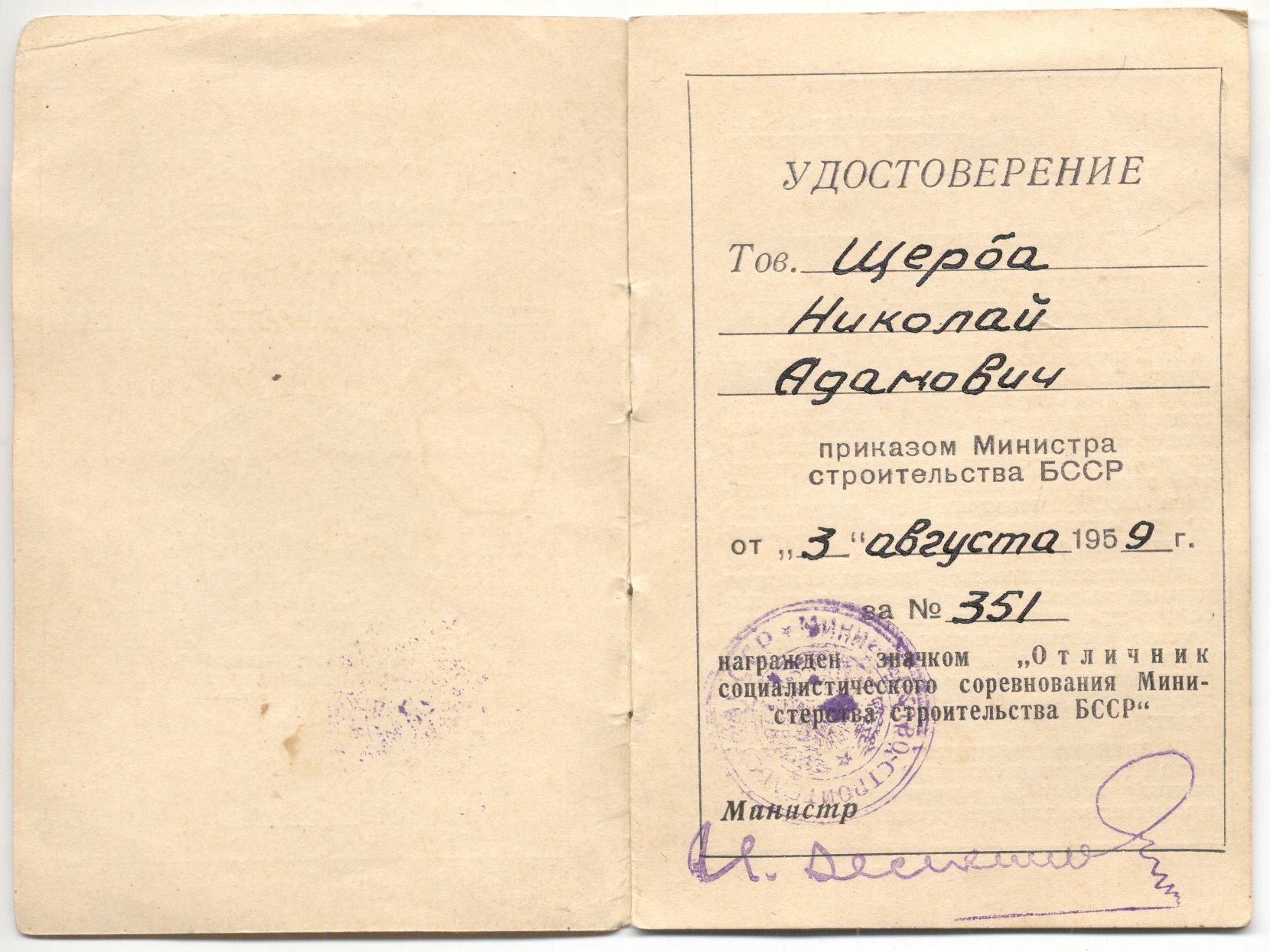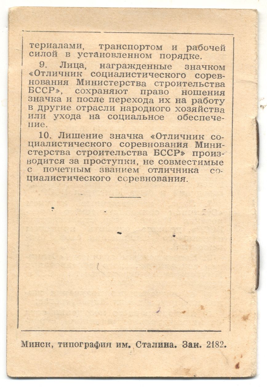 Знак ОСС министерство строительства БССР № 721(ММД) с ранним доком 1959 года