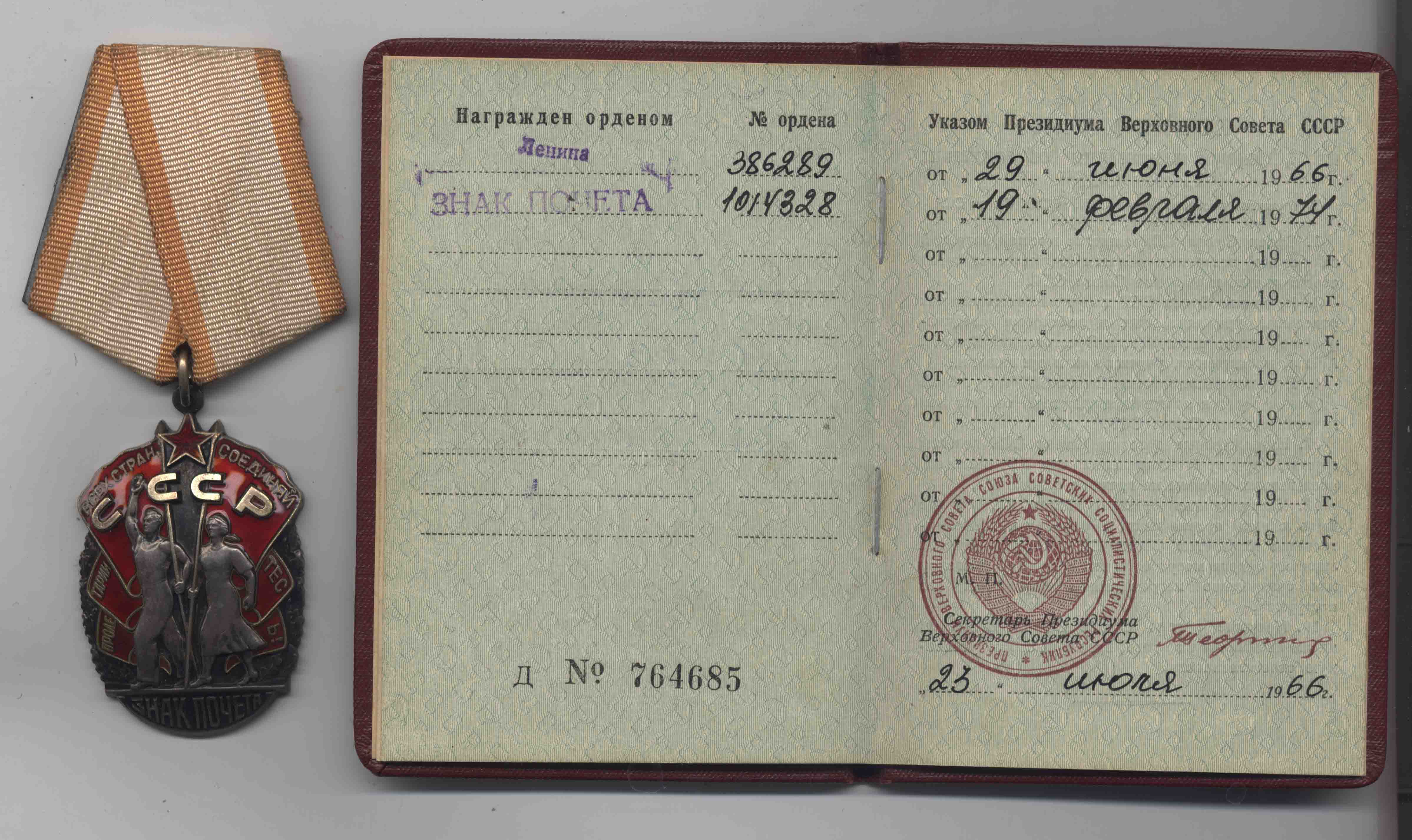 Знак Почета № 1014328 на Солощенко Михаила Лаврентьевича (указ от 19 февраля 1974).