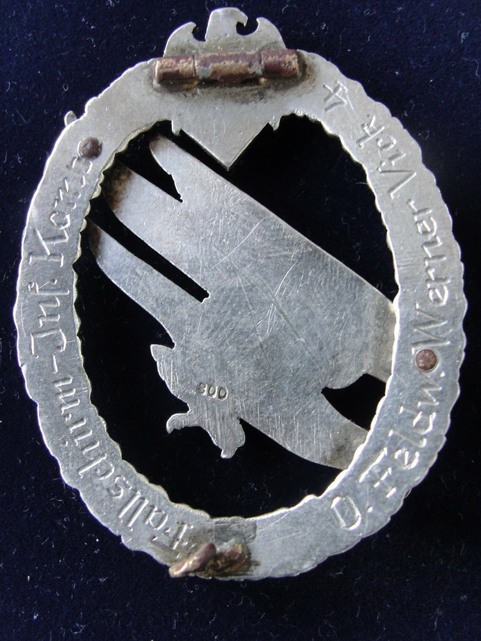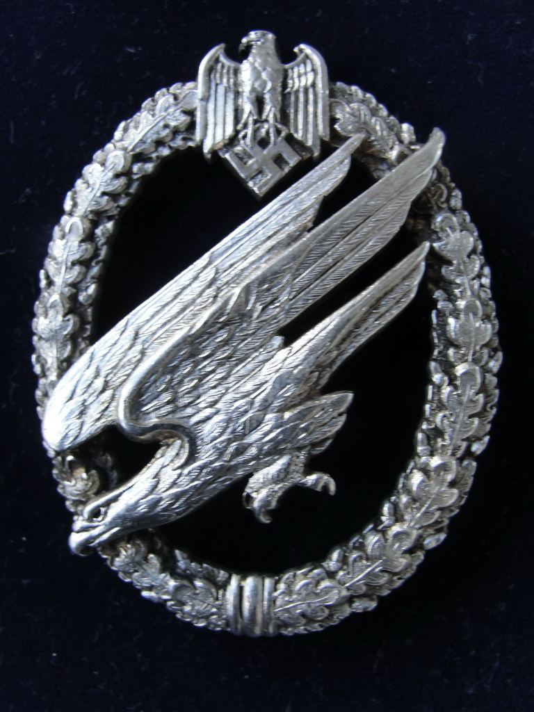 Предлагаю вашему вниманию очень редкий знак Парашютиста Вермахта , частный заказ , производитель Юнкер , серебро 800 пробы, принадлежал обер-фельдфебелю Вернеру Вику , № 4 - это порядковый номер полученной лицензии квалификации парашютиста , самый ранний номер из всех известных . Точное количество заказанных знаков не известно . Знак обсуждался на Саммлере . Доп. фото по запросу.