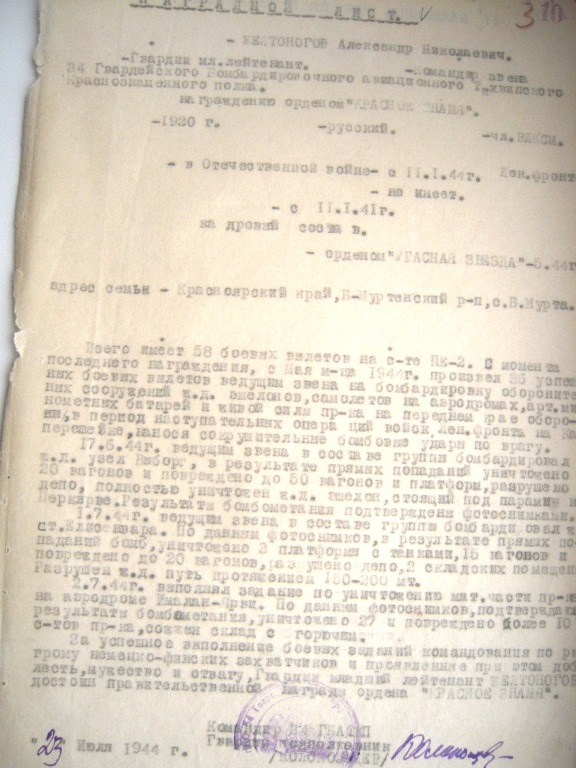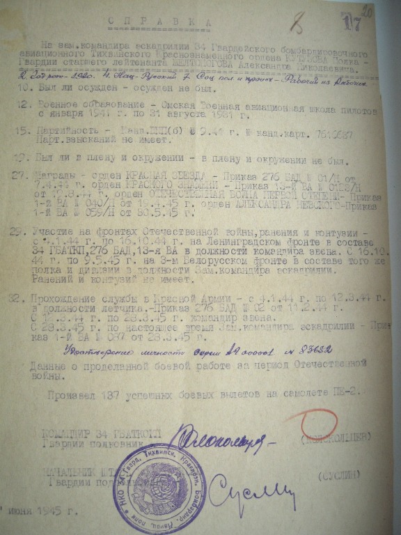 Справка о боевой работе в период ВОВ.