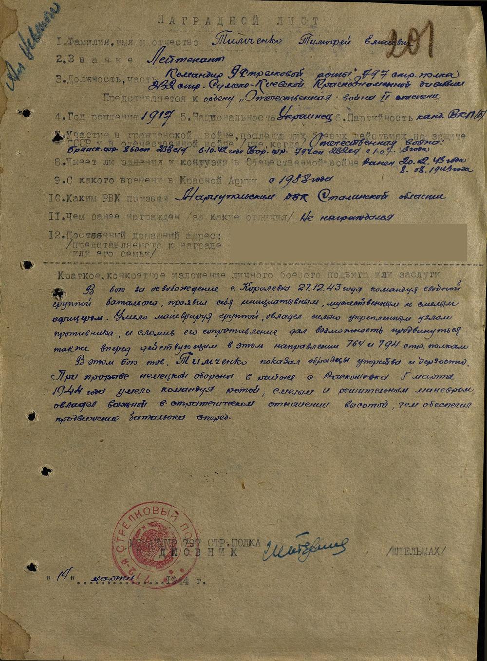 Одна награда (судя по Подвиг Народа) пехотного офицера за образцы упорства и дерзости