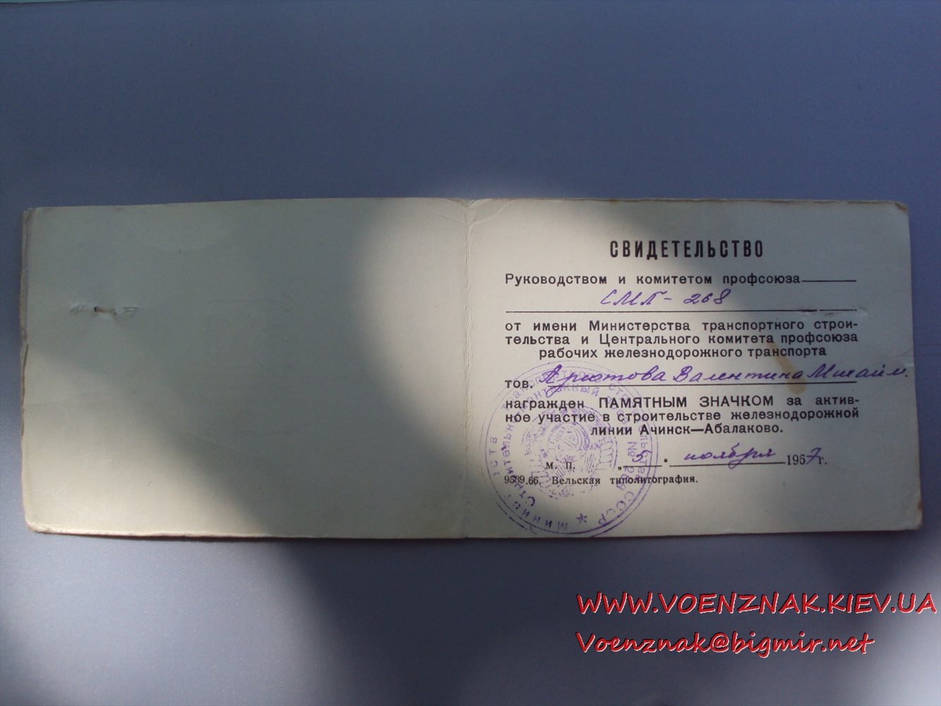 Знак с документом За активное участие в строительстве железнодорожной линии Ачинск-Абалаково