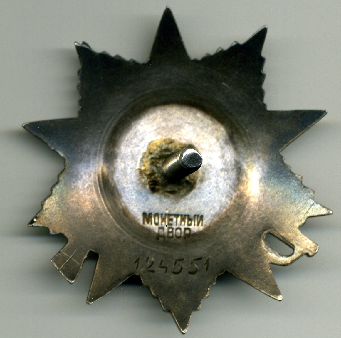 • Вариант 3. Ордена третьего варианта характеризуются наличием на реверсе четко очерченного правильного круга диаметром около 22 мм, слегка смещенного от геометрического центра знака. На ряде знаков также может быть незначительно смещен от центра и нарезной штифт. Подобные ордена получили условное наименование "эксцентрик". Клеймо выполнено в две строки и расположено ниже штифта. Под клеймом находится серийный номер, выполненный штихелем. Минимальный известный номер - 117888, максимальный - 133604.
