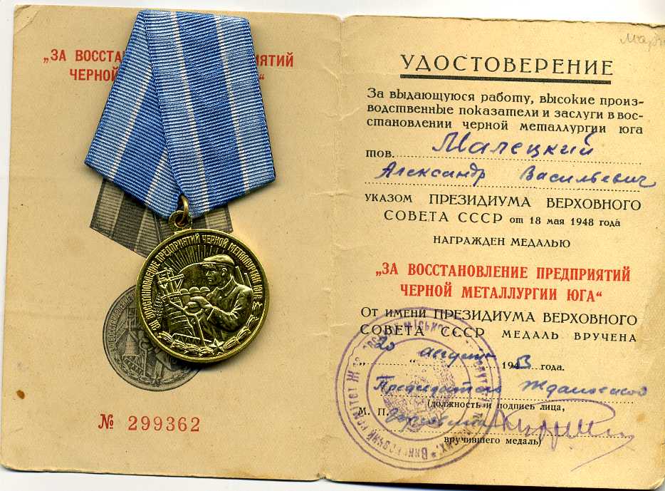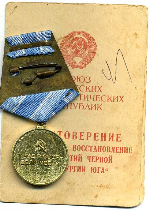Медали Серп и Молот, За Трудовую Доблесть, За Трудовое Отличие, За Доблестный Труд в Великой Отечественной Войне,За Восстановление Предприятий Чёрной Металлургии Юга, За Восстановление Угольных Шахт Донбасса, За Освоение Целинных Земель, За Строительство БАМ, За Преобразование Нечерноземья РСФСР, За Освоение Недр и Развитие Нефтегазового Комплекса Западной Сибири, Ветеран Труда