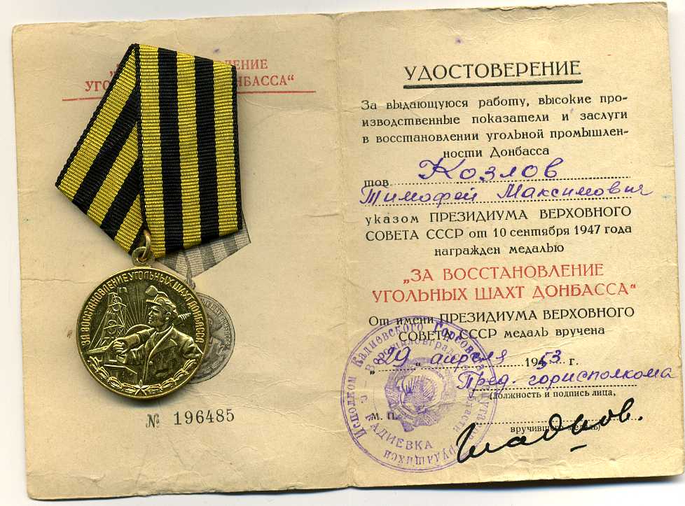 Медали Серп и Молот, За Трудовую Доблесть, За Трудовое Отличие, За Доблестный Труд в Великой Отечественной Войне,За Восстановление Предприятий Чёрной Металлургии Юга, За Восстановление Угольных Шахт Донбасса, За Освоение Целинных Земель, За Строительство БАМ, За Преобразование Нечерноземья РСФСР, За Освоение Недр и Развитие Нефтегазового Комплекса Западной Сибири, Ветеран Труда