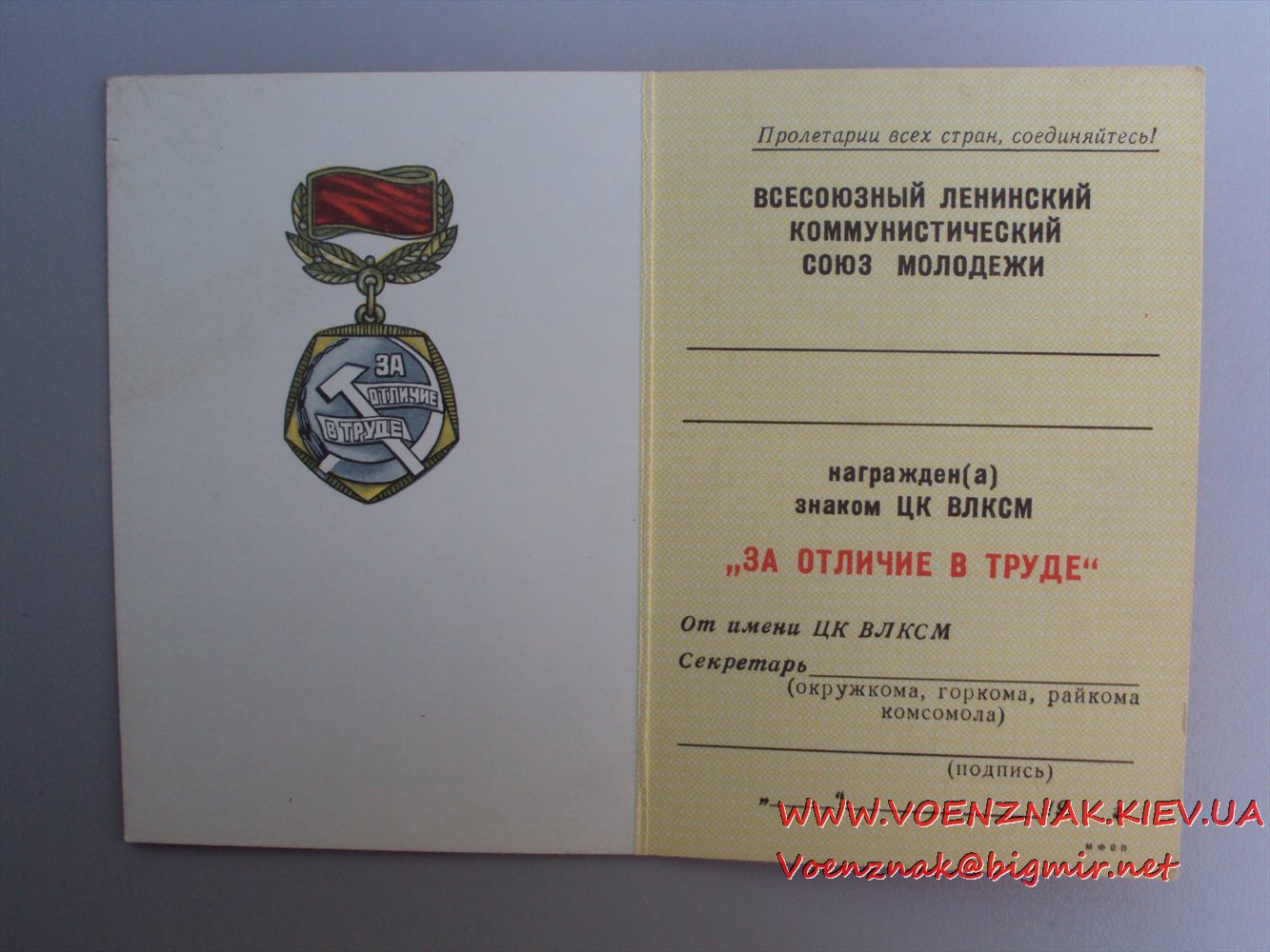 Удостоверение к знаку ЦК ВЛКСМ За отличие в труде, пустое, незаполненное