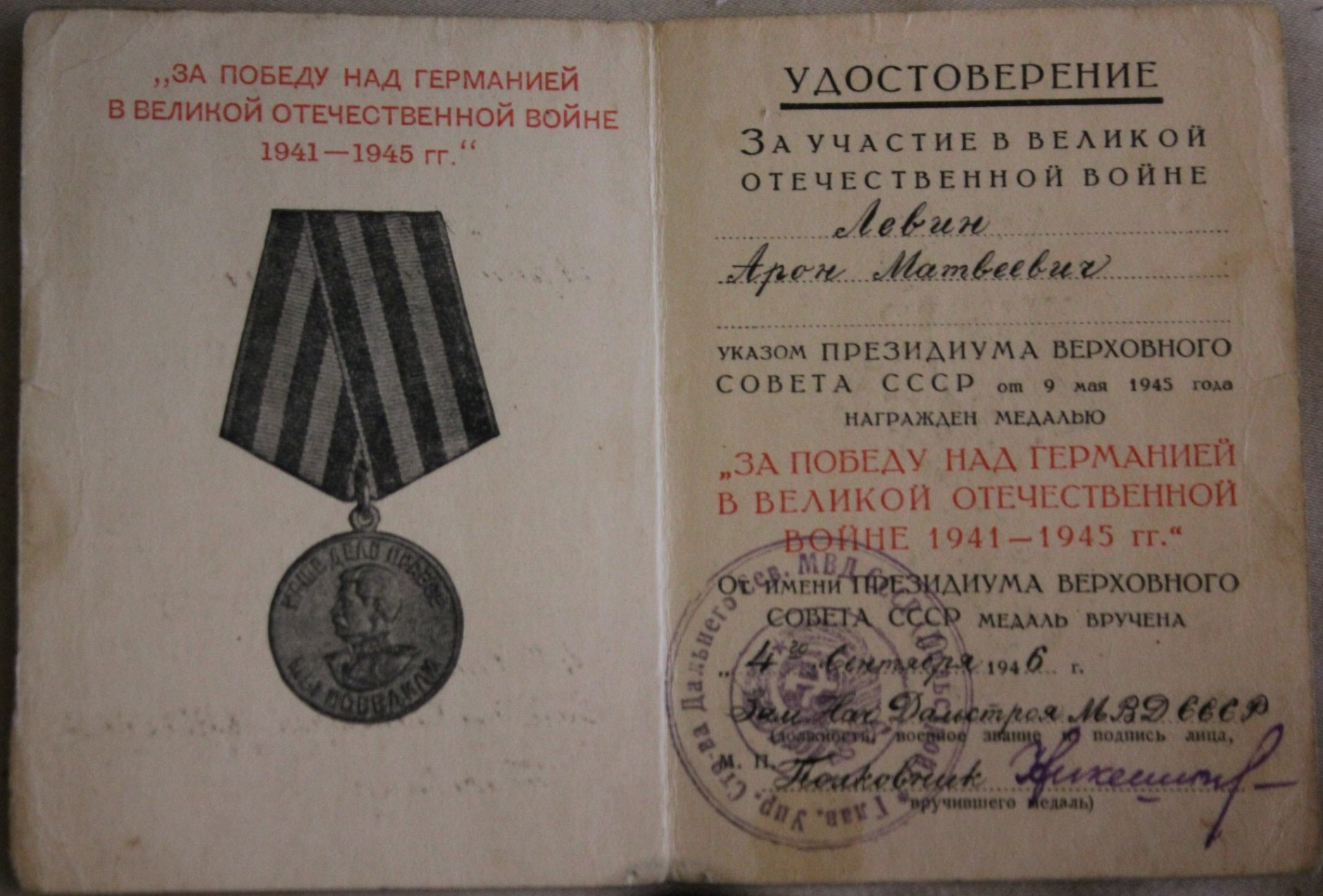 Левин Арон Матвеевич упоминается в книге Солженицына "Архипелаг Гулаг", как получивший 25 лет лагерей http://yandex.ru/search/?text. Медалью участника ВОВ как видно был награжден в лагерях.