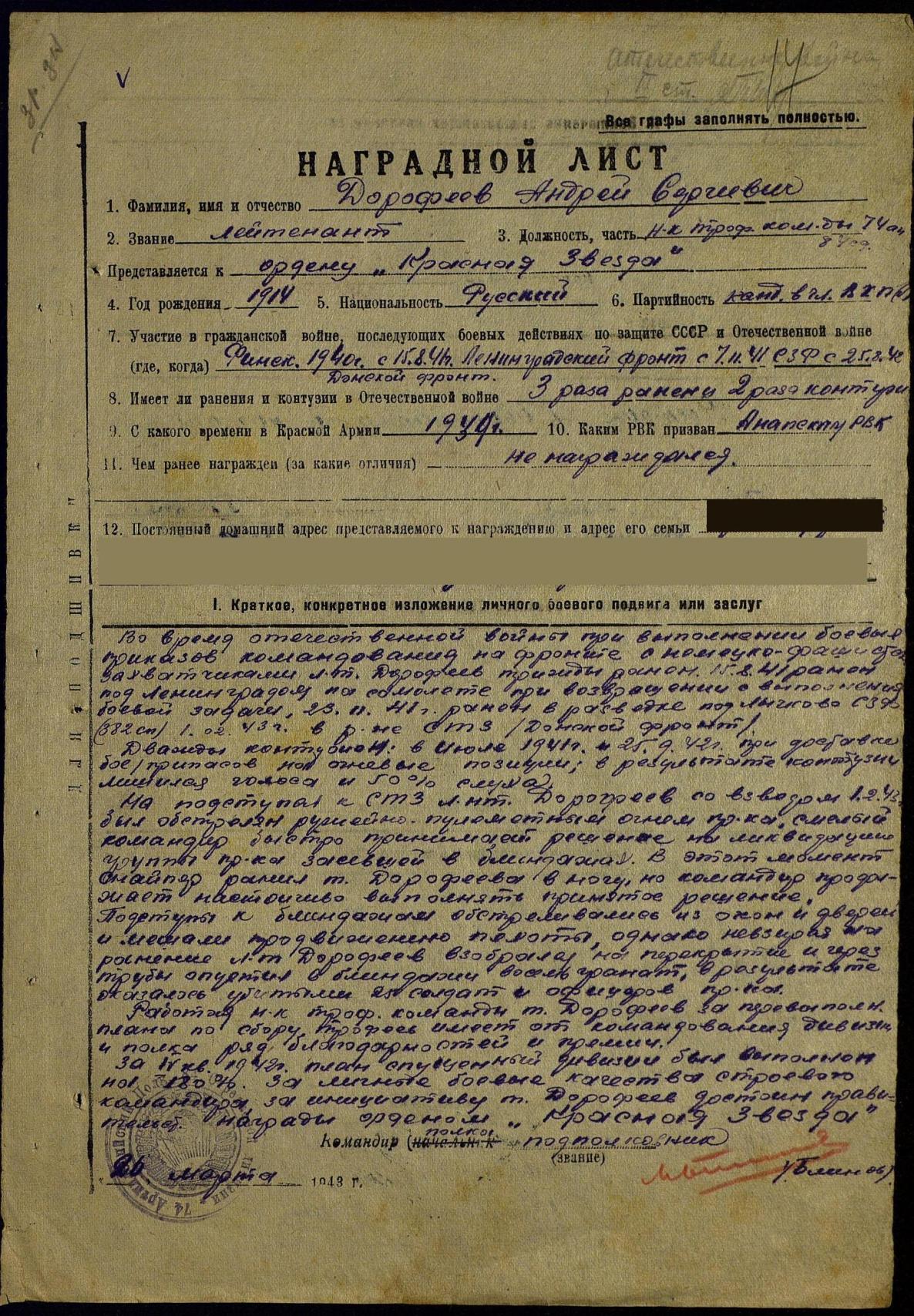 Наградной по совокупности, но где только не был. даже в самолете был ранен, в Сталинграде закидывал блиндаж гранатами. Затем потерял голос и 50% слуха, списали в трофейную команду.