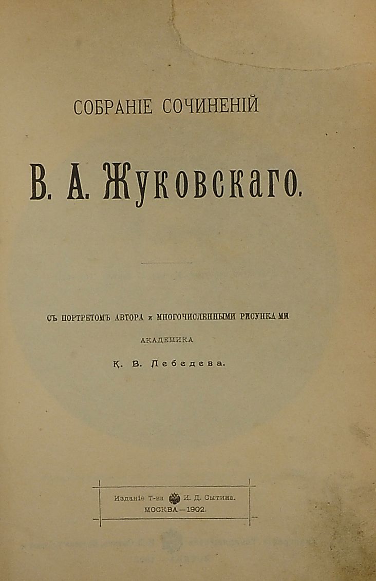 Жуковский, В.А. Собрание сочинений В.А. Жуковского. С портр. авт., [биогр. очерком] и многочисленными рисунками акад. К.В. Лебедева. - М.: т-во И.Д. Сытина, 1902год. - 336 стр. : ил.; 22,5х15 см. В составном переплете эпохи. Хорошая сохранность. Потертости переплета, утрата верхнего правого угла титульного листа, утрата форзаца.
