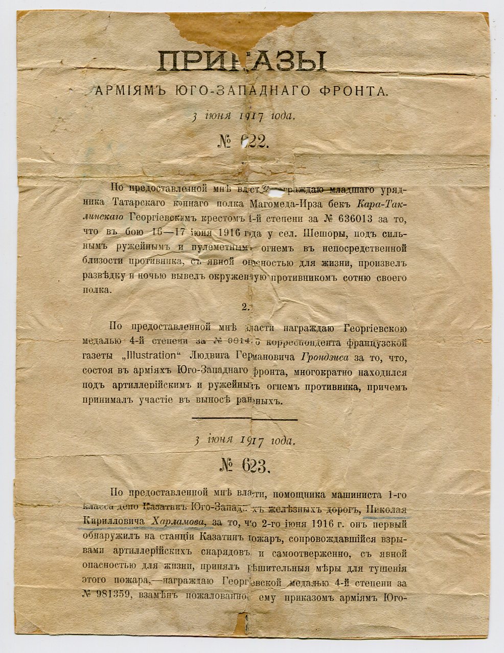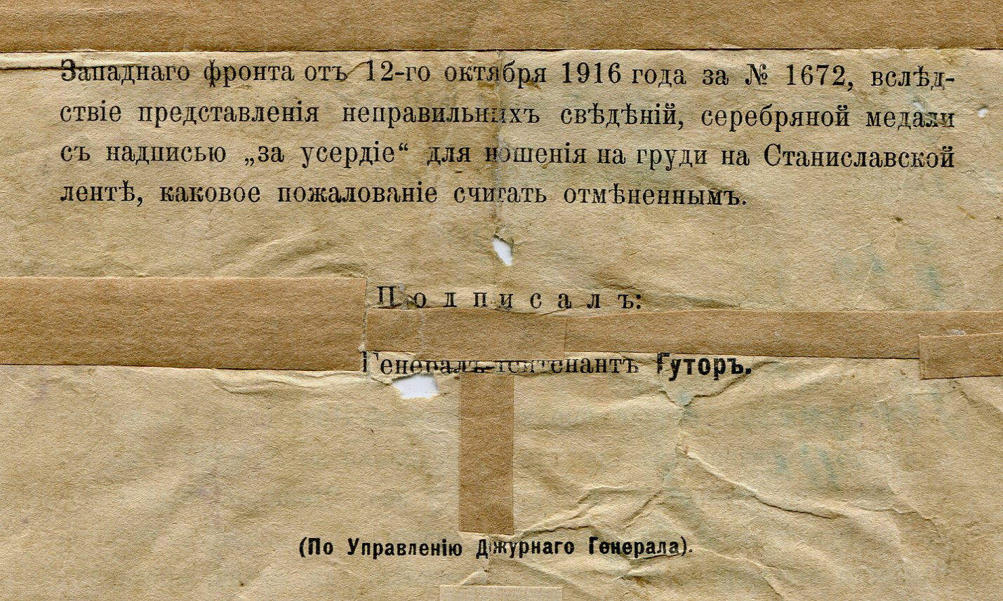 Как видно из Приказа, изначально награжден медалью "За усердие", впоследствии замененной "Храбростью".