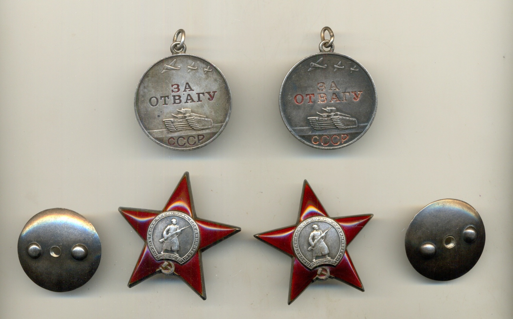 патина на КЗ однотипная, если что отличается игра света, в живую один в один (состояние эмалей и т.д. тоже, правда возле сима на одной есть чешуйка)...патина на отвагах немного отличается, хотя есть однородные куски, так как одна из них весела на общей колодке (более светлая), другая более тёмная на одинарной колодке (сняла для синхронности)...