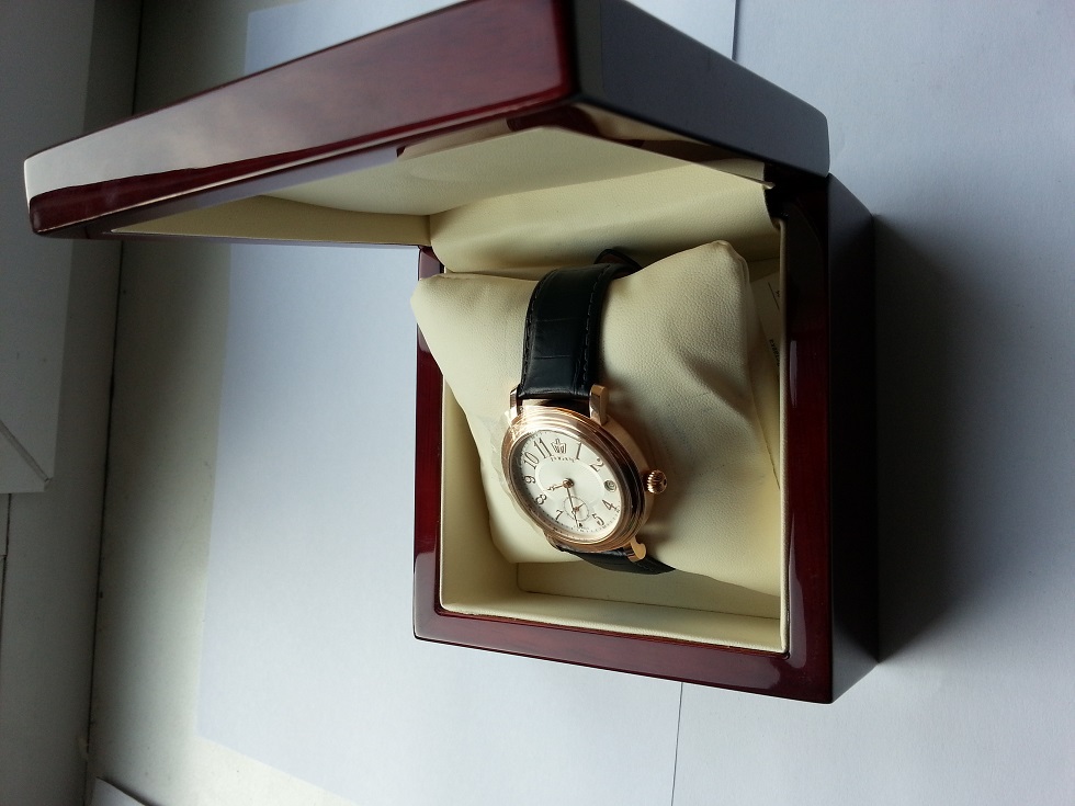 В деревяной коробке с кожаными вставками.