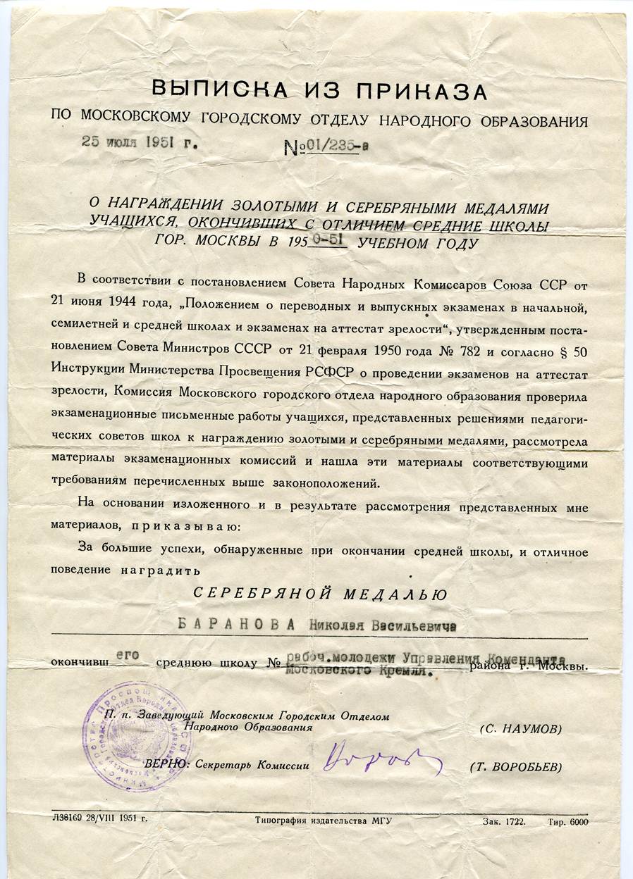 Док на серебряную медаль Школа РМ Управления коменданта Кремля 1951 г.
