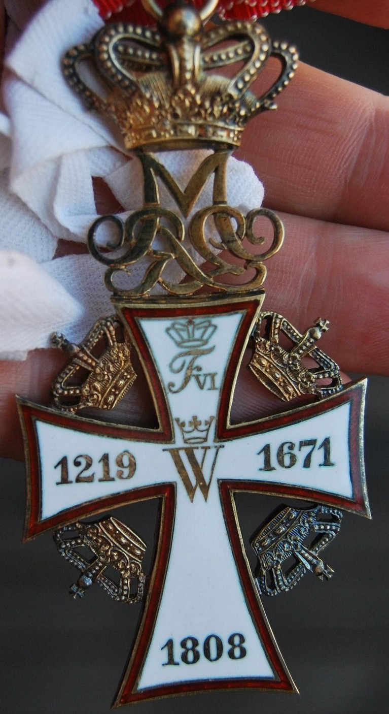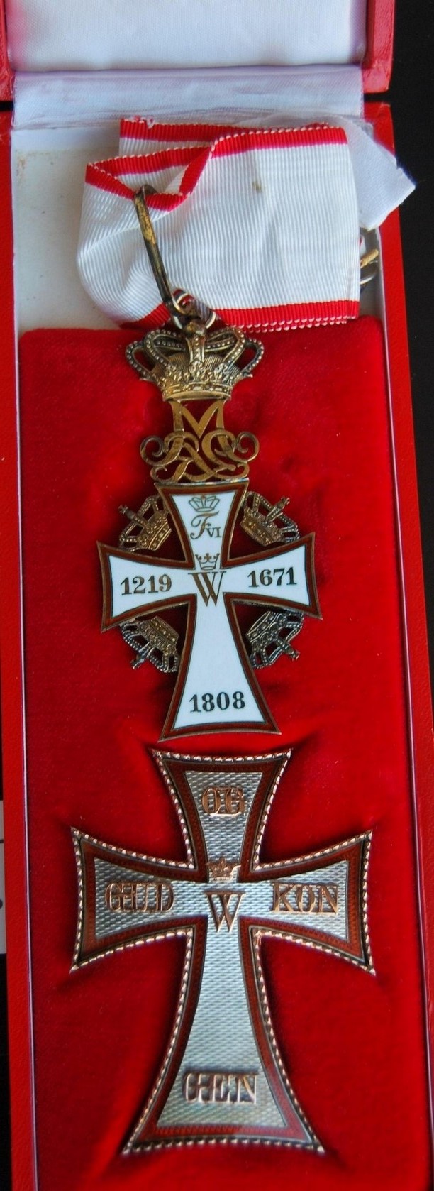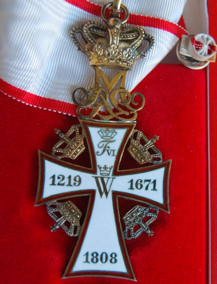 Знак ордена представляет собой патинированный латинский крест белой эмали из золота (рыцарский — из серебра). Края креста изогнуты вовнутрь. Крест имеет ободок красной эмали. В центре креста расположена буква «C» с цифрой «5» внутри (в память Кристиана V), увенчанная короной. На концах креста, начиная с левого, по часовой стрелке расположены слова девиза GUD OG KONGEN (Бог и Король). На реверсе расположена буква «W» (в память короля Вальдемара) и на концах креста даты — «1219», «1671» и «1808». В верхней части знака размещена буква «R» (Rex или Regina) и инициалы правящего монарха. Выше инициалов расположена корона. Между концами креста также размещены золотые короны. Крест гранд-командора имеет на аверсе 14 бриллиантов, расположенных в форме латинского креста, а также ещё бриллианты, украшающие знак. На белом эмалевом реверсе знака расположены увенчанные коронами инициалы Вальдемара II, Кристиана V и Фредерика VI, а также девиз ордена.
