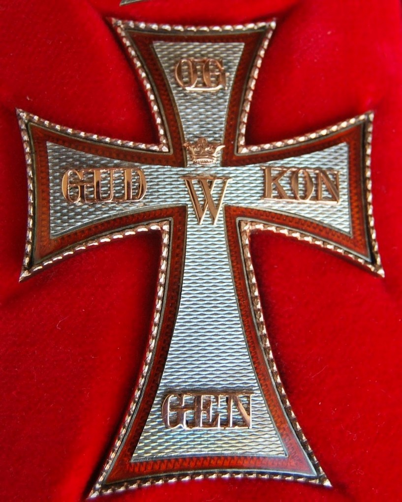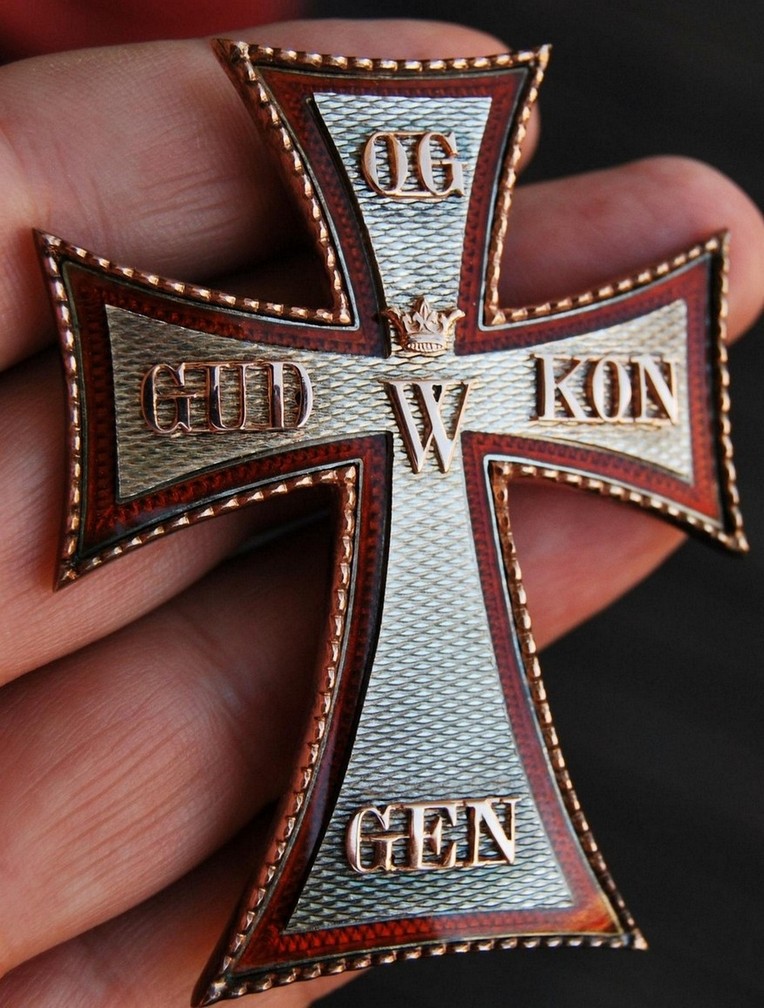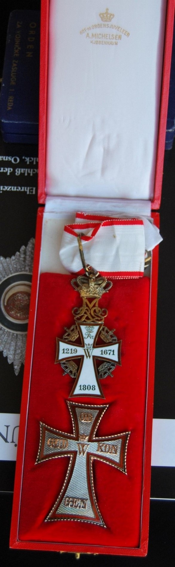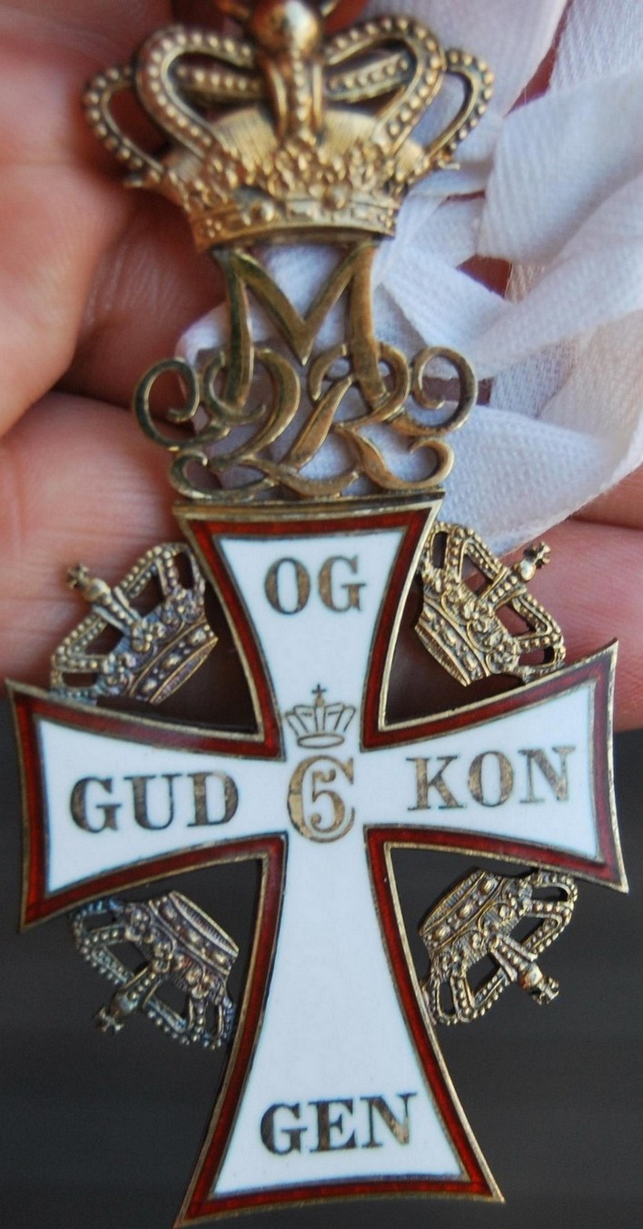 Знак ордена представляет собой патинированный латинский крест белой эмали из золота (рыцарский — из серебра). Края креста изогнуты вовнутрь. Крест имеет ободок красной эмали. В центре креста расположена буква «C» с цифрой «5» внутри (в память Кристиана V), увенчанная короной. На концах креста, начиная с левого, по часовой стрелке расположены слова девиза GUD OG KONGEN (Бог и Король). На реверсе расположена буква «W» (в память короля Вальдемара) и на концах креста даты — «1219», «1671» и «1808». В верхней части знака размещена буква «R» (Rex или Regina) и инициалы правящего монарха. Выше инициалов расположена корона. Между концами креста также размещены золотые короны. Крест гранд-командора имеет на аверсе 14 бриллиантов, расположенных в форме латинского креста, а также ещё бриллианты, украшающие знак. На белом эмалевом реверсе знака расположены увенчанные коронами инициалы Вальдемара II, Кристиана V и Фредерика VI, а также девиз ордена.