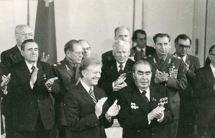Первый зам.мин.обороны СССР Н.В.Огарков,К.У.Черненко,Д.Д.Устинов,А.А.Громыко в Редутном зале дворца Хофсбург в Вене перед подписанием Л.И.Брежневым и Президентом США Д.Картером советско-американских документов об ограничении стратегических наступательных вооружений ОСВ-2.