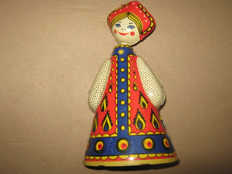 материал жесть,размер16см.принцип работы матрешки цикличный,движение в перед,полных 2 оборота,движение в перед,игрушка в рабочем состояние,ключ в наличие,цена 1200р+дорога.