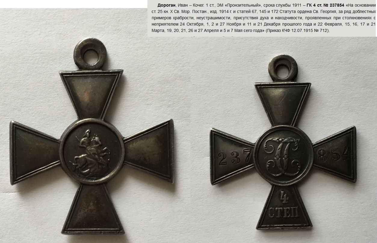 Дороган, Иван – Кочег. 1 ст., ЭМ «Пронзительный», срока службы 1911 – ГК 4 ст. № 237854 «На основании ст. 25 кн. X Св. Мор. Постан., изд. 1914 г. и статей 67, 145 и 172 Статута ордена Св. Георгия, за ряд доблестных примеров храбрости, неустрашимости, присутствия духа и находчивости, проявленных при столкновениях с неприятелем 24 Октября, 1, 2 и 27 Ноября и 11 и 21 Декабря прошлого года и 22 Февраля, 15, 16, 17 и 21 Марта, 19, 20, 21, 26 и 27 Апреля и 5 и 7 Мая сего года» (Приказ КЧФ 12.07.1915 № 712).