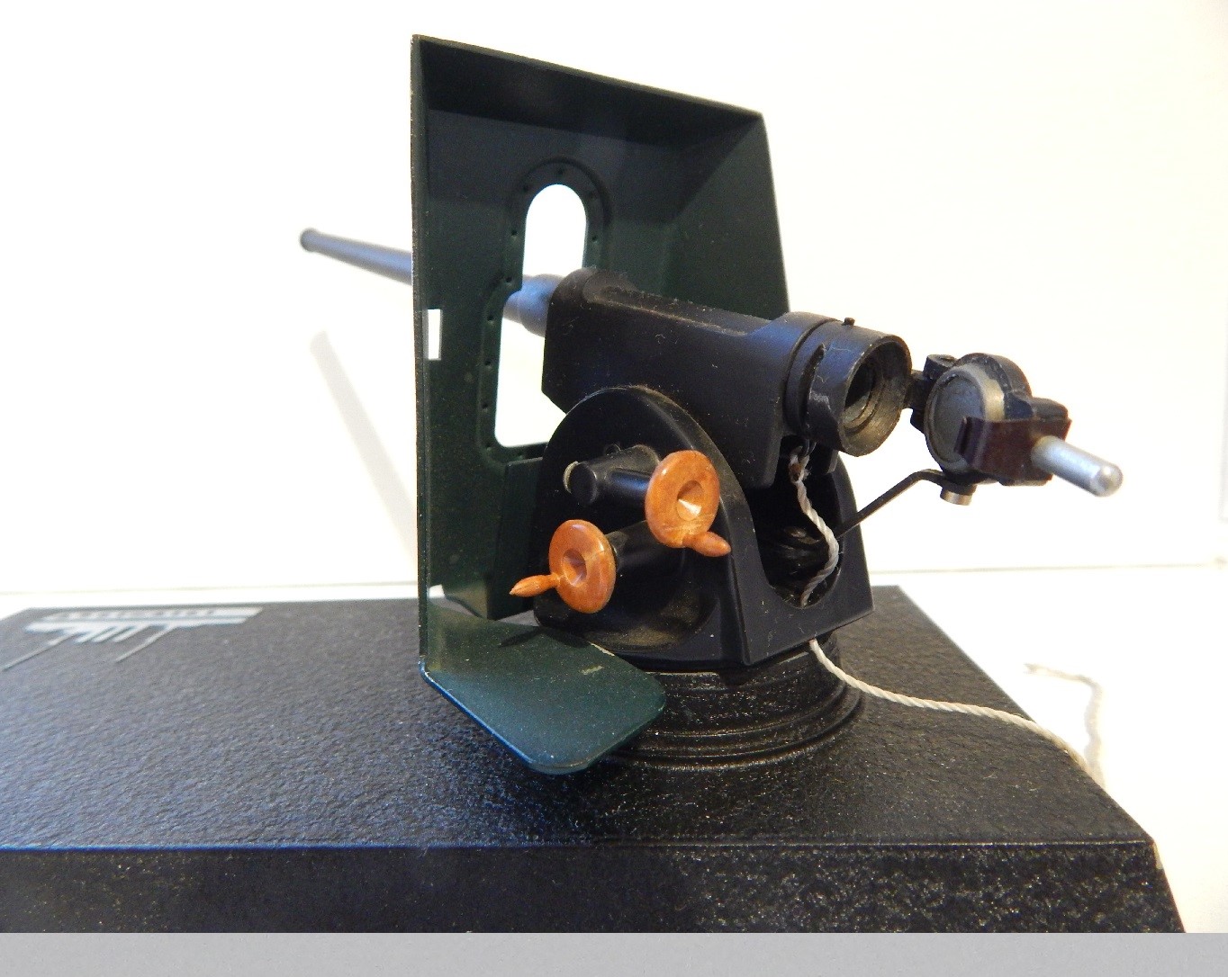В металле. Р-р основания 18х9 см. Крутится в горизонтальной плоскости....Механизм работает - отводишь и тянешь за веревку....