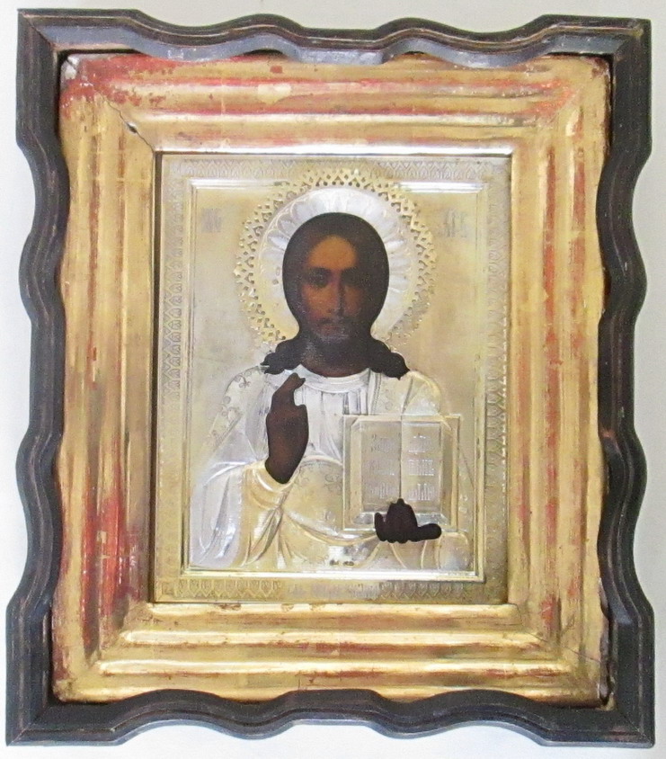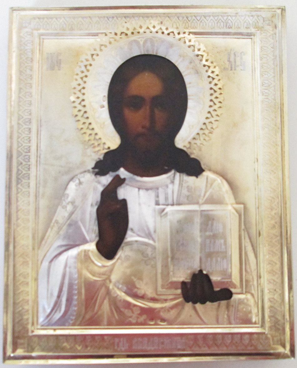 Икона "Господь Вседержитель" в серебренном окладе.. Клейма: головка повернута вправо 84 пр.клеймо мастера П.Е На окладе родное золочение и конфарение.Прекрасное состояние. Пробы стоят на венце и на торце оклада.22,4х17,9 см.МПЦ 70 000р