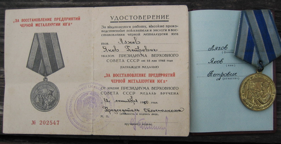 Медали Серп и Молот, За Трудовую Доблесть, За Трудовое Отличие, За Доблестный Труд в Великой Отечественной Войне,За Восстановление Предприятий Чёрной Металлургии Юга, За Восстановление Угольных Шахт Донбасса, За Освоение Целинных Земель, За Строительство БАМ, За Преобразование Нечерноземья РСФСР, За Освоение Недр и Развитие Нефтегазового Комплекса Западной Сибири, Ветеран Труда