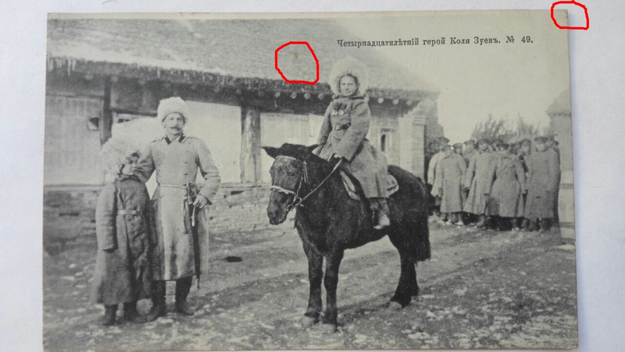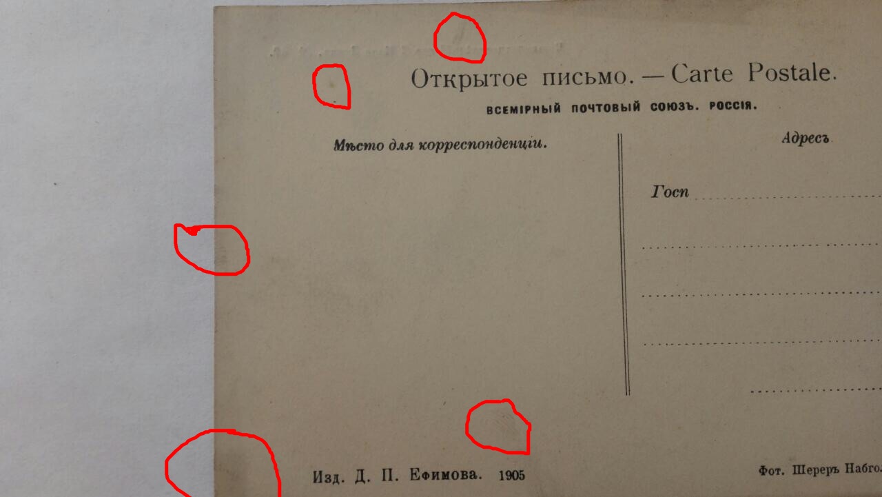 Я надеюсь, обозначенные Вами пятна, на любой из открыток, которые есть у меня в наличии, не сильно повлияют на цену.