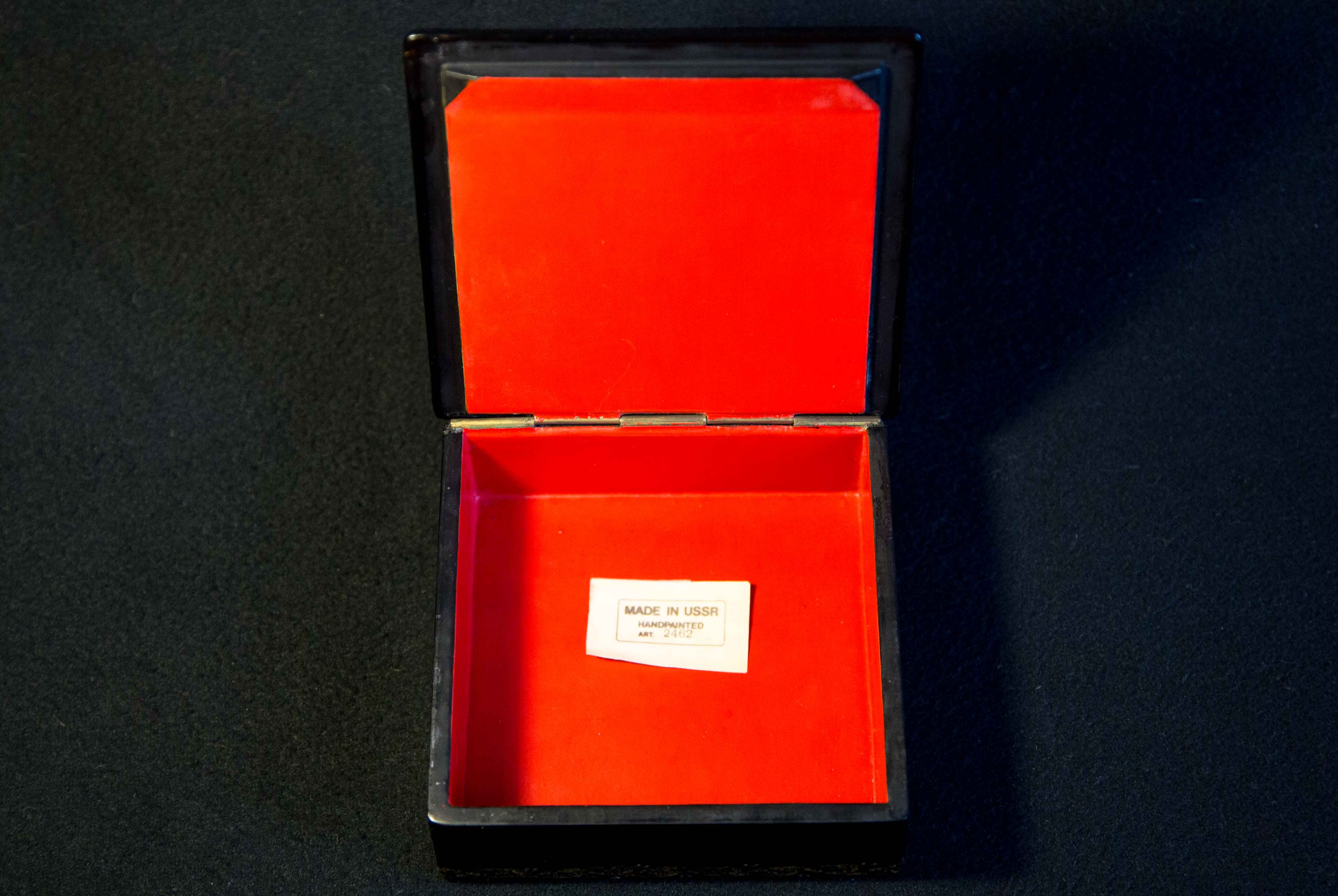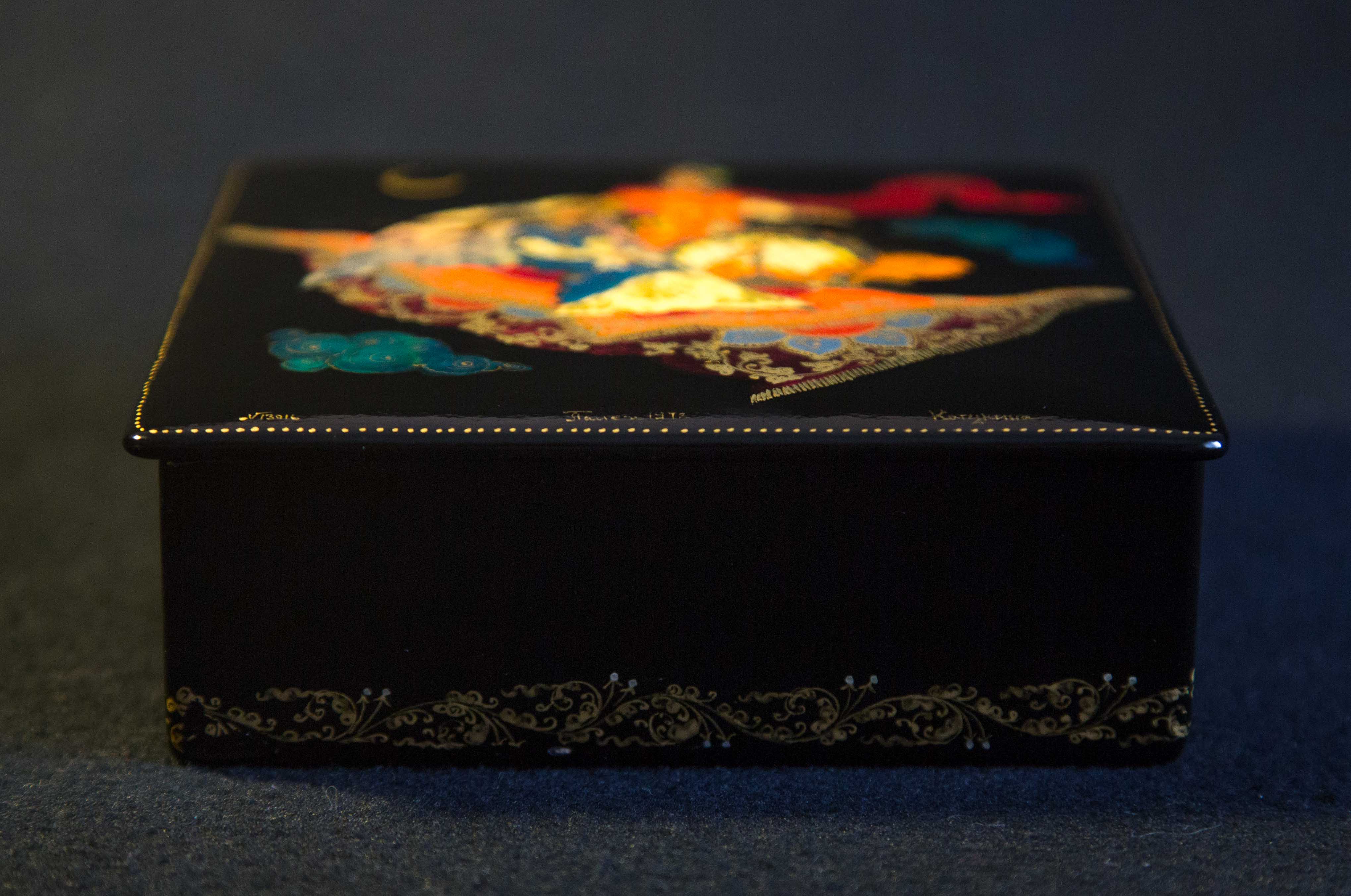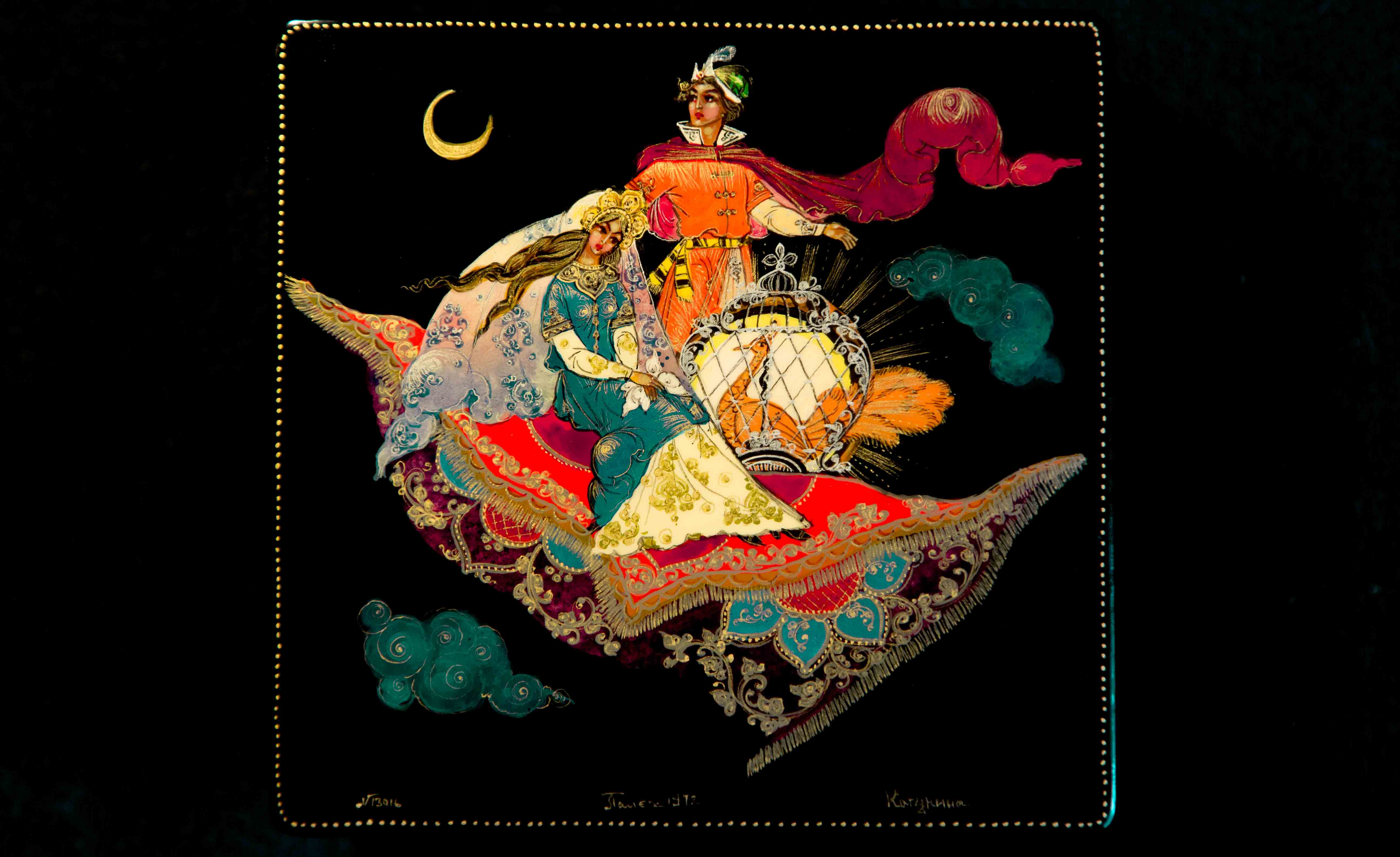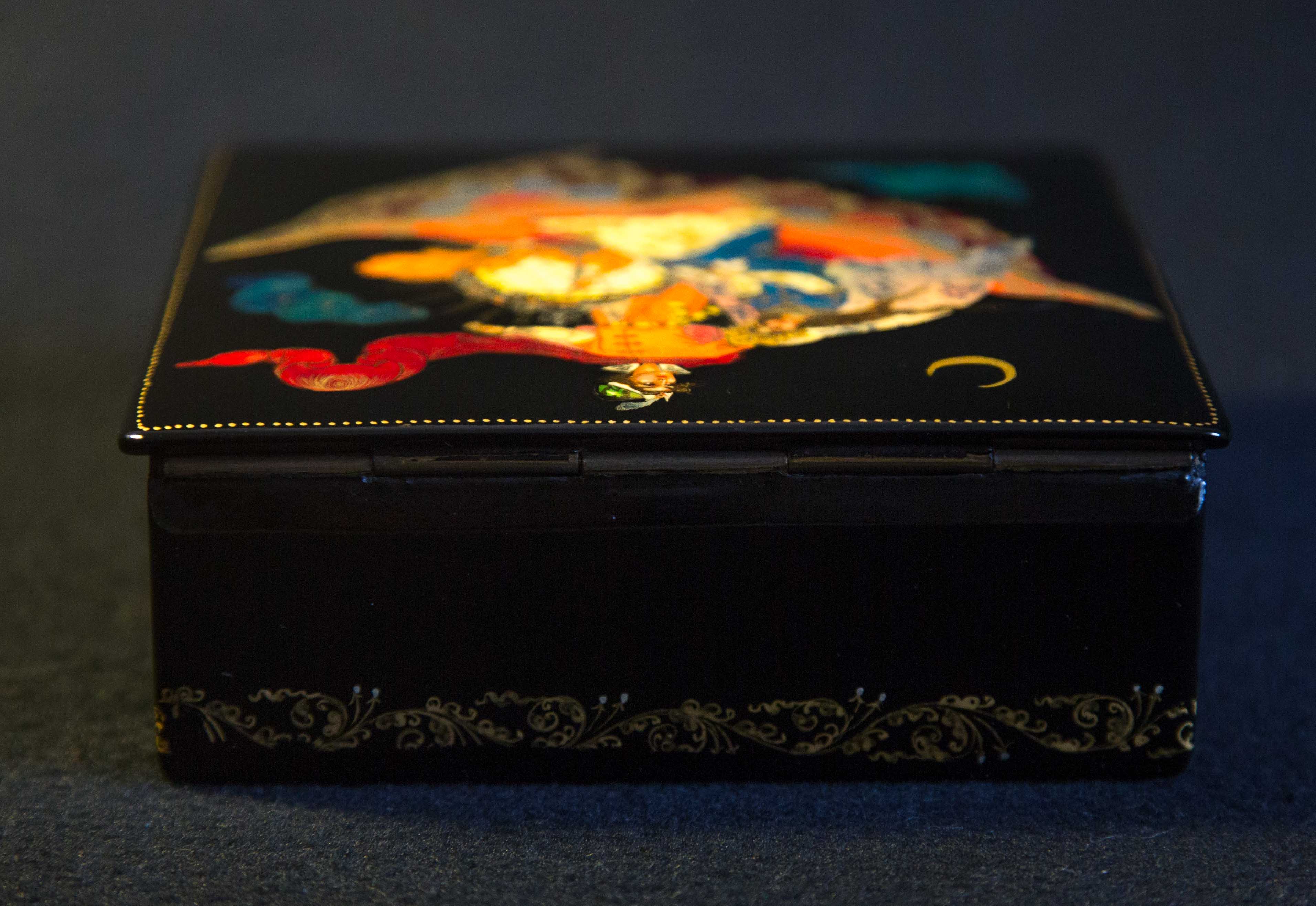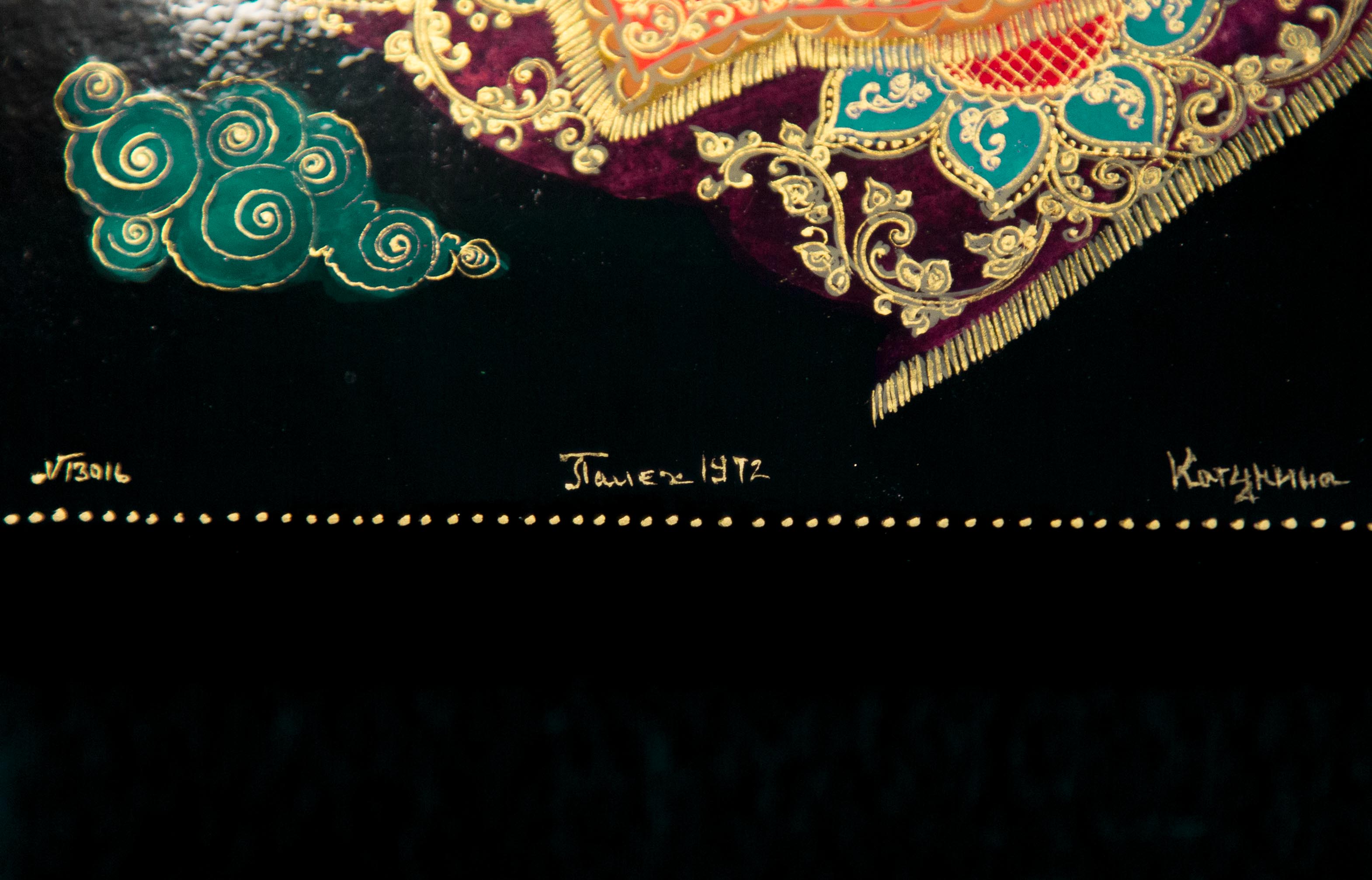 Шкатулка, "Ковер-самолет» выполненная в 1972 году, по разработанному ей образцу 1962 года и заслужившего диплом на Всесоюзной художественной выставке “Художники – детям”. проходившей в ГМИИ г.Москва. Этот образец в 1960е-70е копировали такие художники как Виноградова, Белова, Сурина, Буреева М. и многие другие.