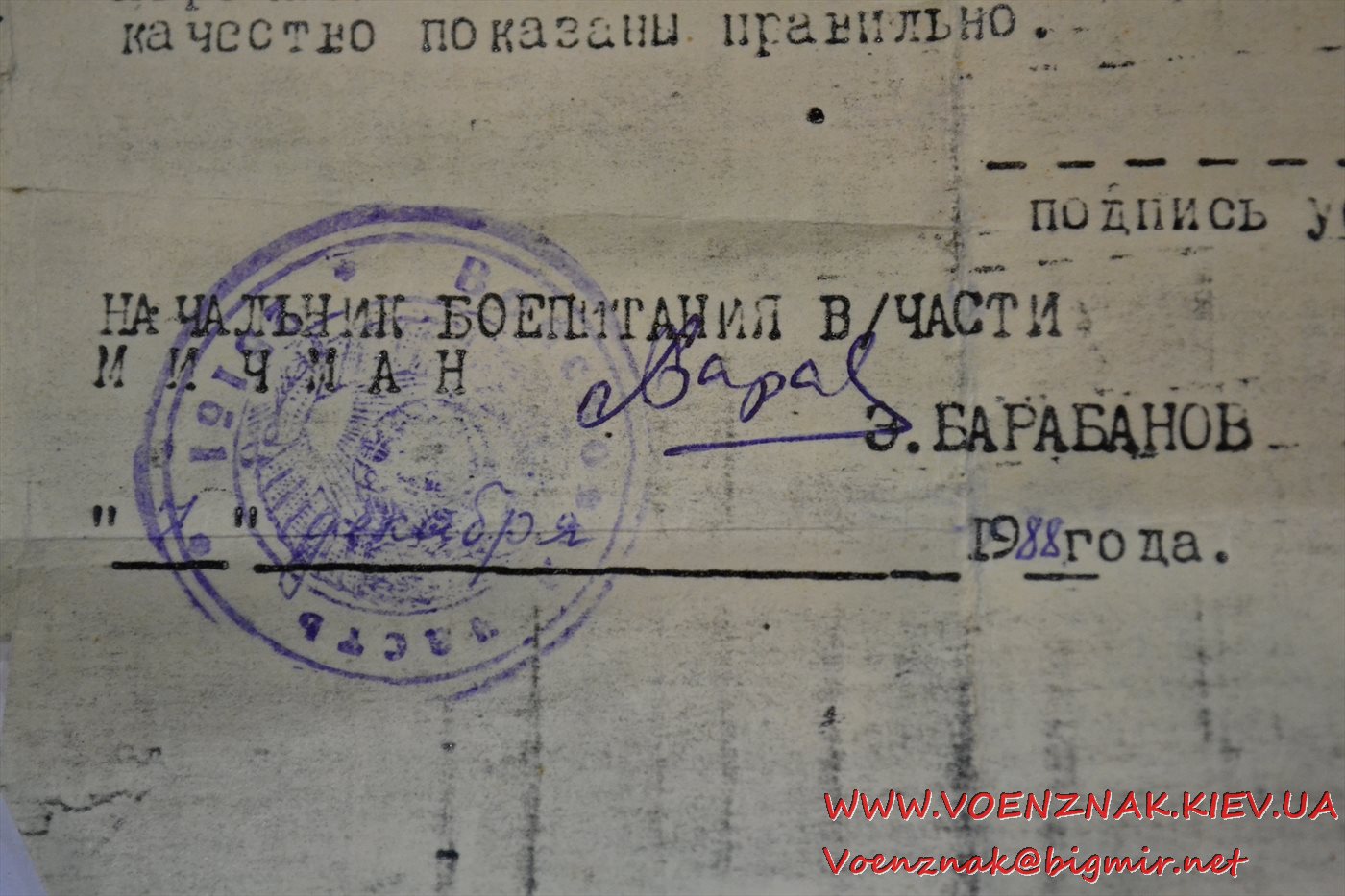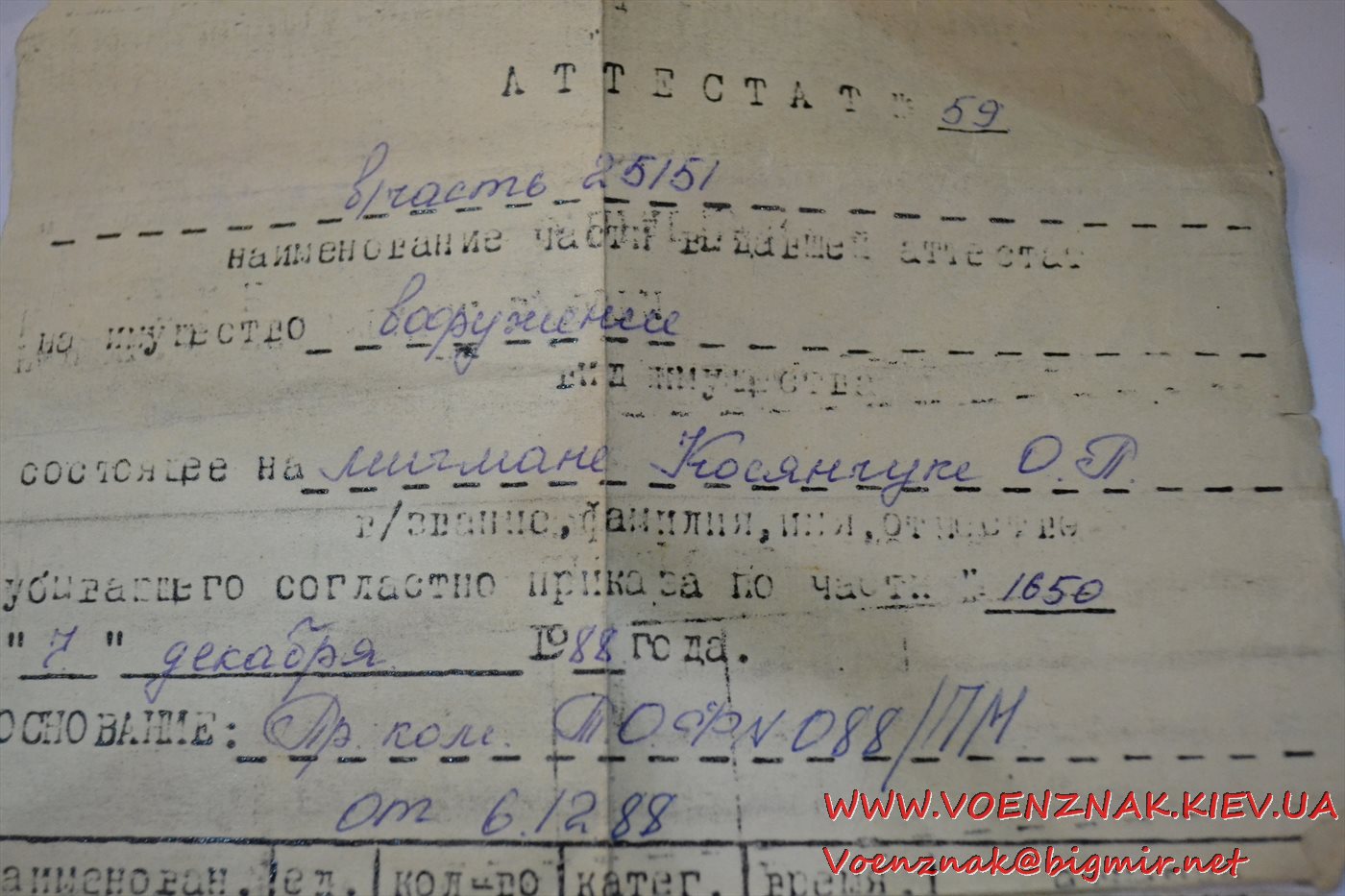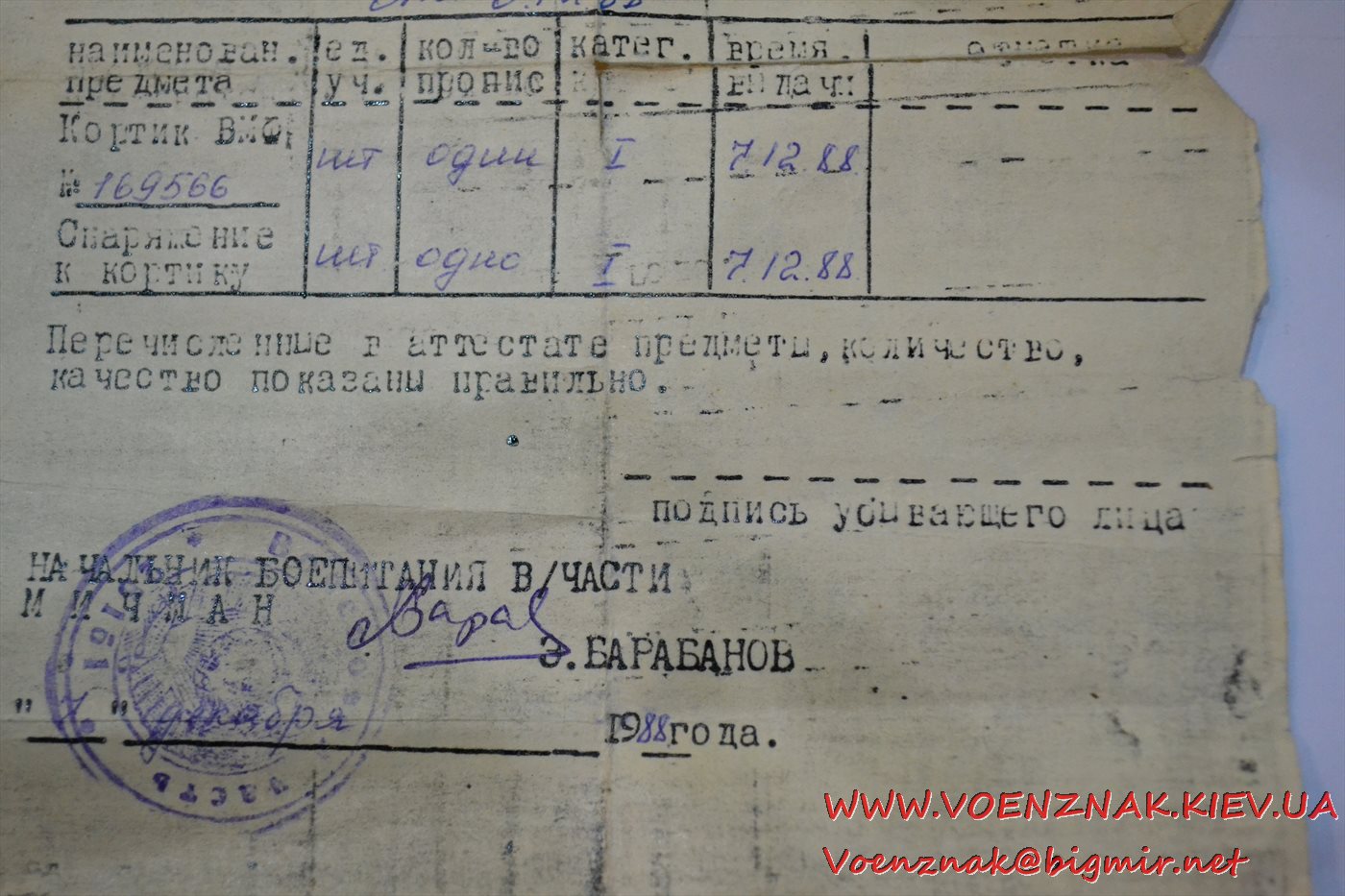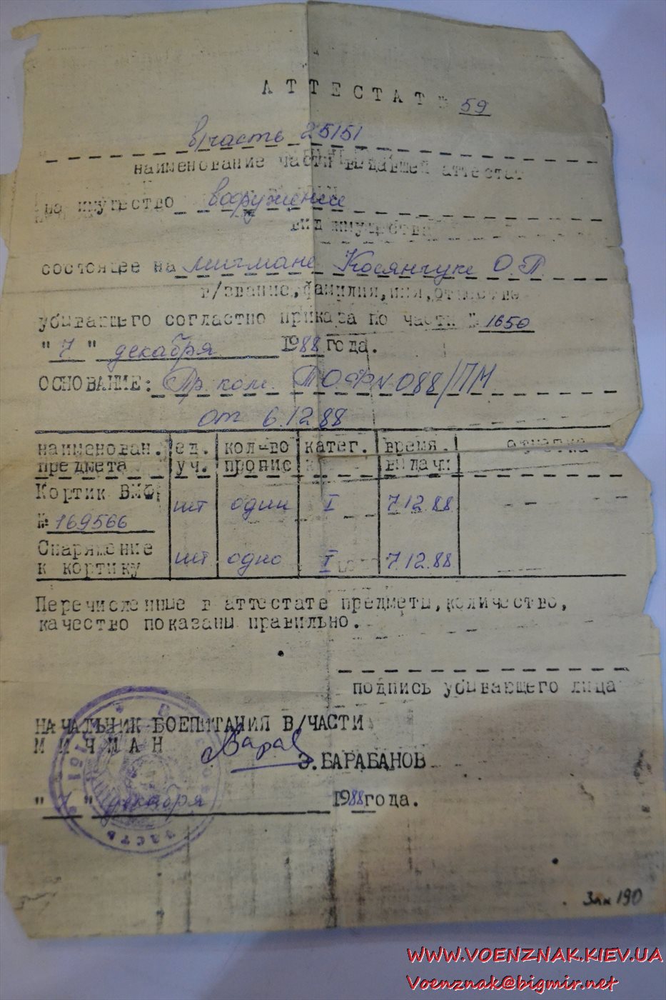 Аттестат (документ) на морской кортик 1988 года