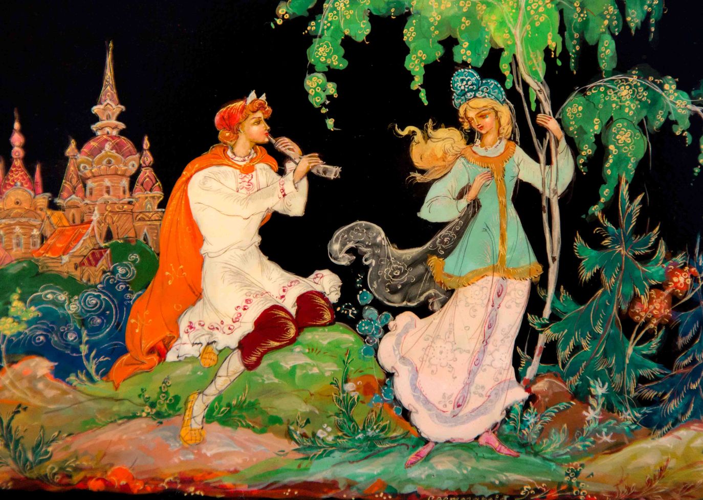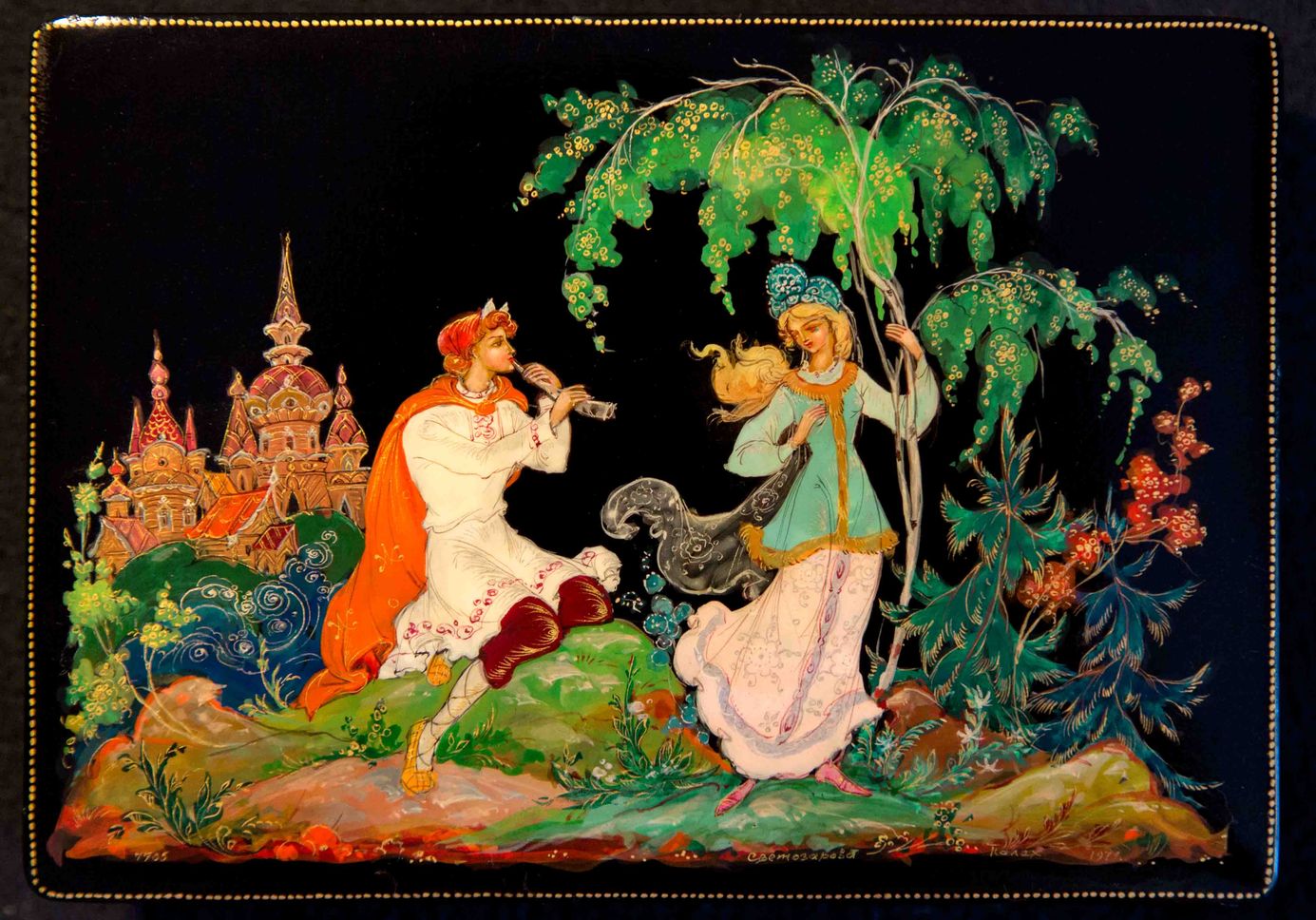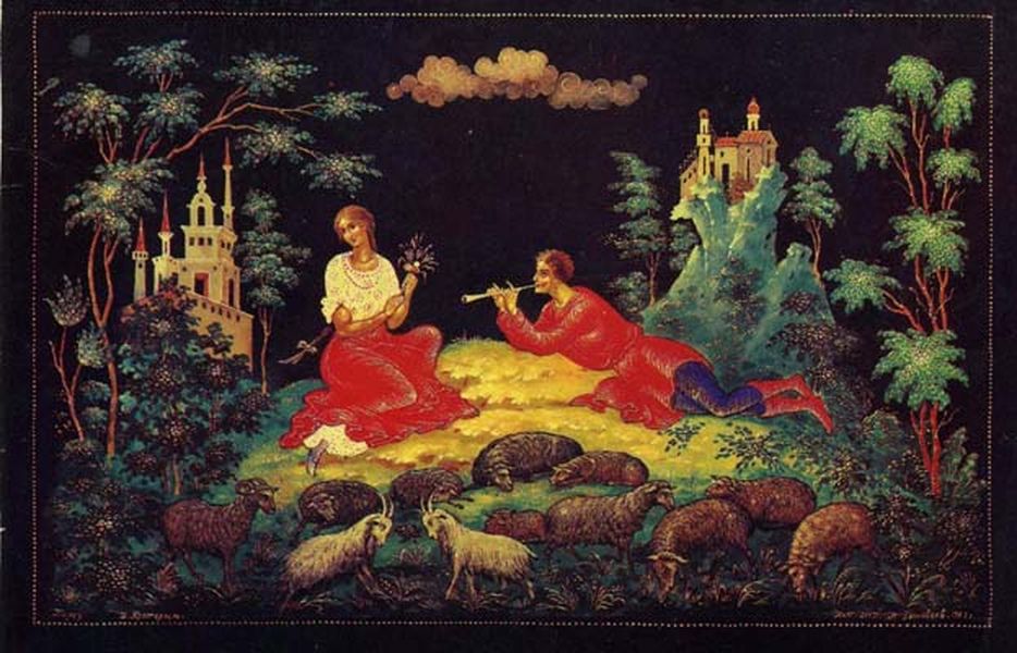 В основе данной работы, лежит творческая переработка Евлампией Дмитриевной знаменитой, хрестоматийной работы ее отца - «Идиллия», по которой до сих пор учатся основам палехской композиции студенты ПХУ. Заменив безымянных персонажей на всем понятных героев эпоса, поменяв их местами и развернув друг к другу, убрав лишнее (овечек, горку) что позволило укрупнить фигуры, Светозаровой в этом образце удалось добиться яркого звучания молодости и весны. При этом динамично бурлящее за спиной Леля море служит контрастной нотой, призванной разрушить обывательский образ отцовской «Идиллии», придавая работе больше жизненной силы.