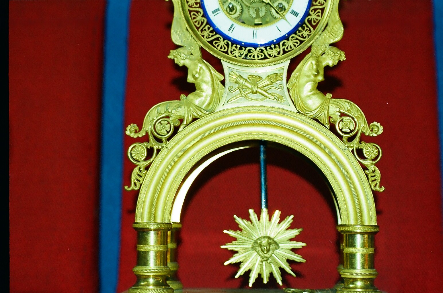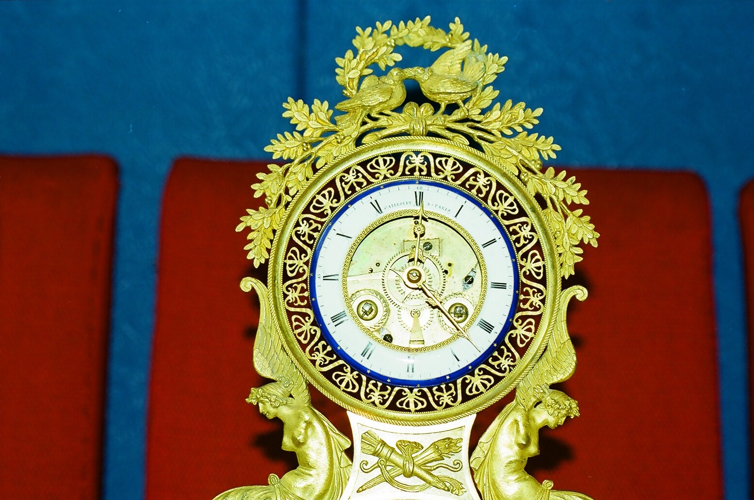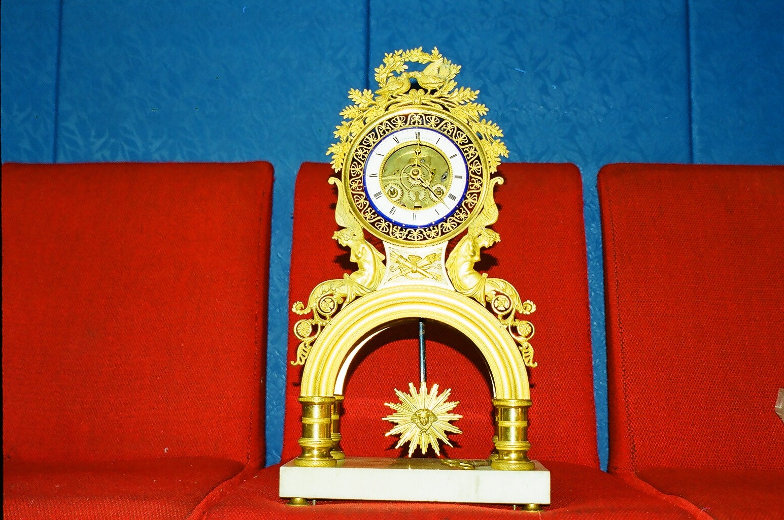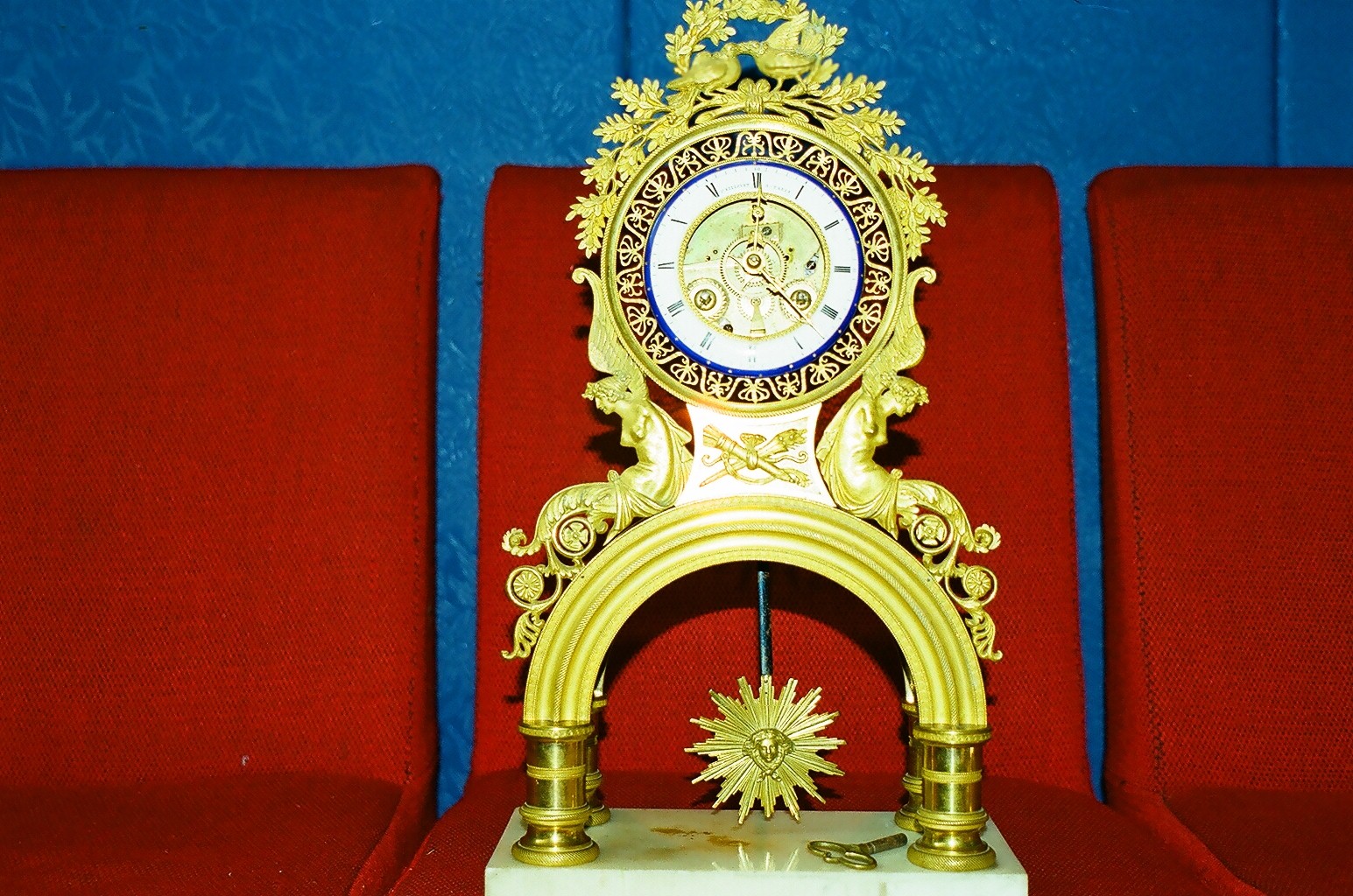 На ходу в абсолютном люксн,без реставрации.Ыфсота около 30см.(+-).Огненое золочение.эмалевый циферблат,скелетон.бъют час и полчаса.