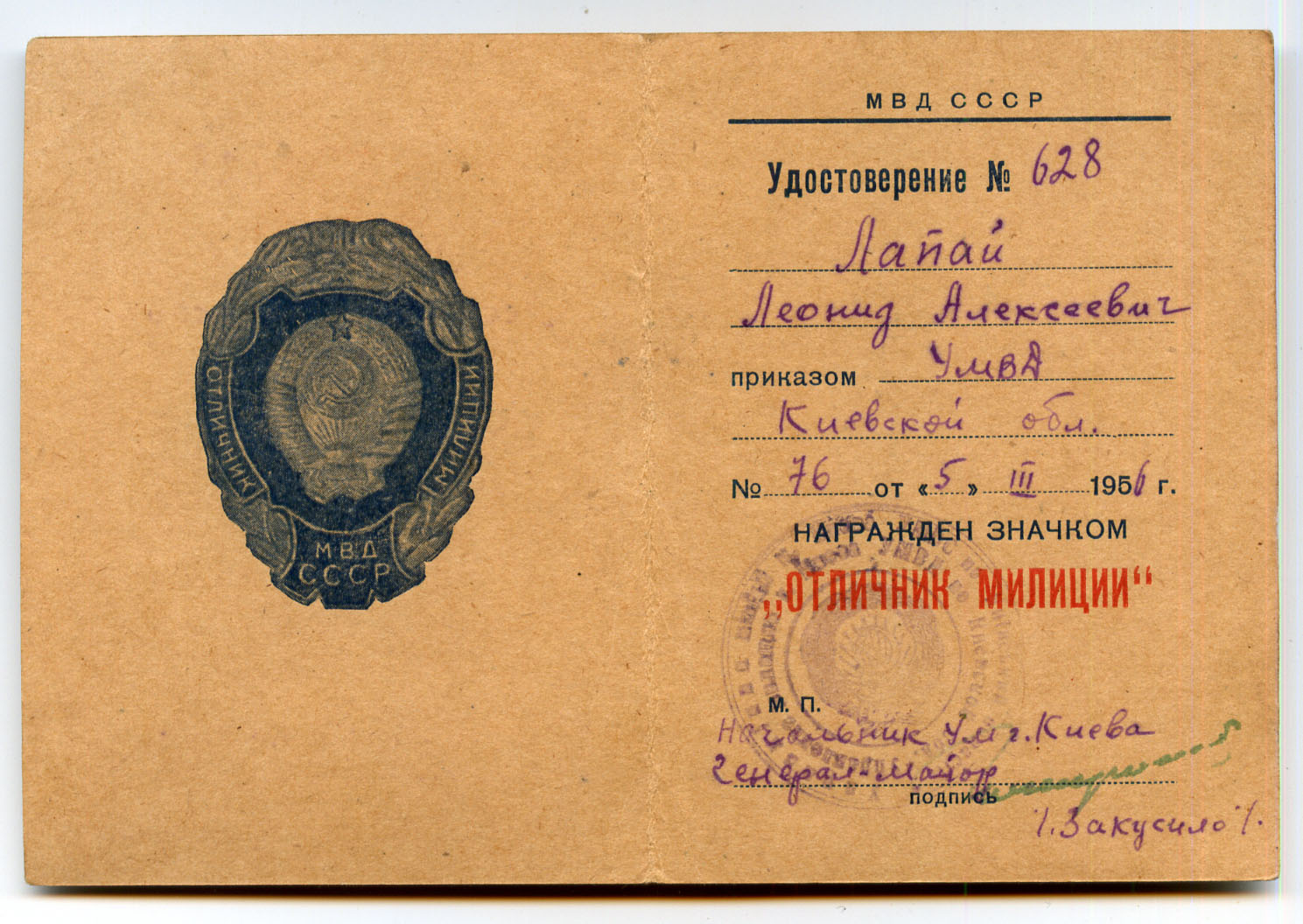 Уд. знак Отличник милиции 1956 подп. генерала. Состояние отличное.