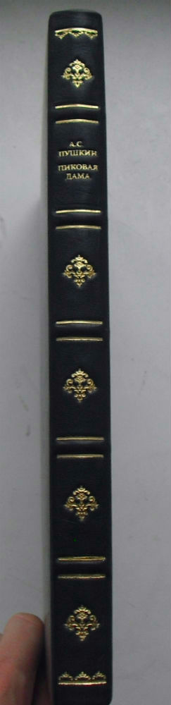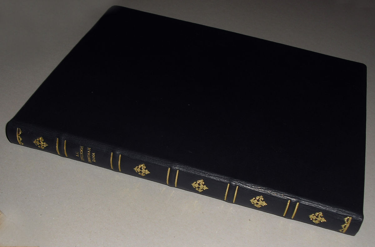 В современном цельнокожаном переплете темно-синего цвета с золотым тиснением по корешку, узорные форзацы.