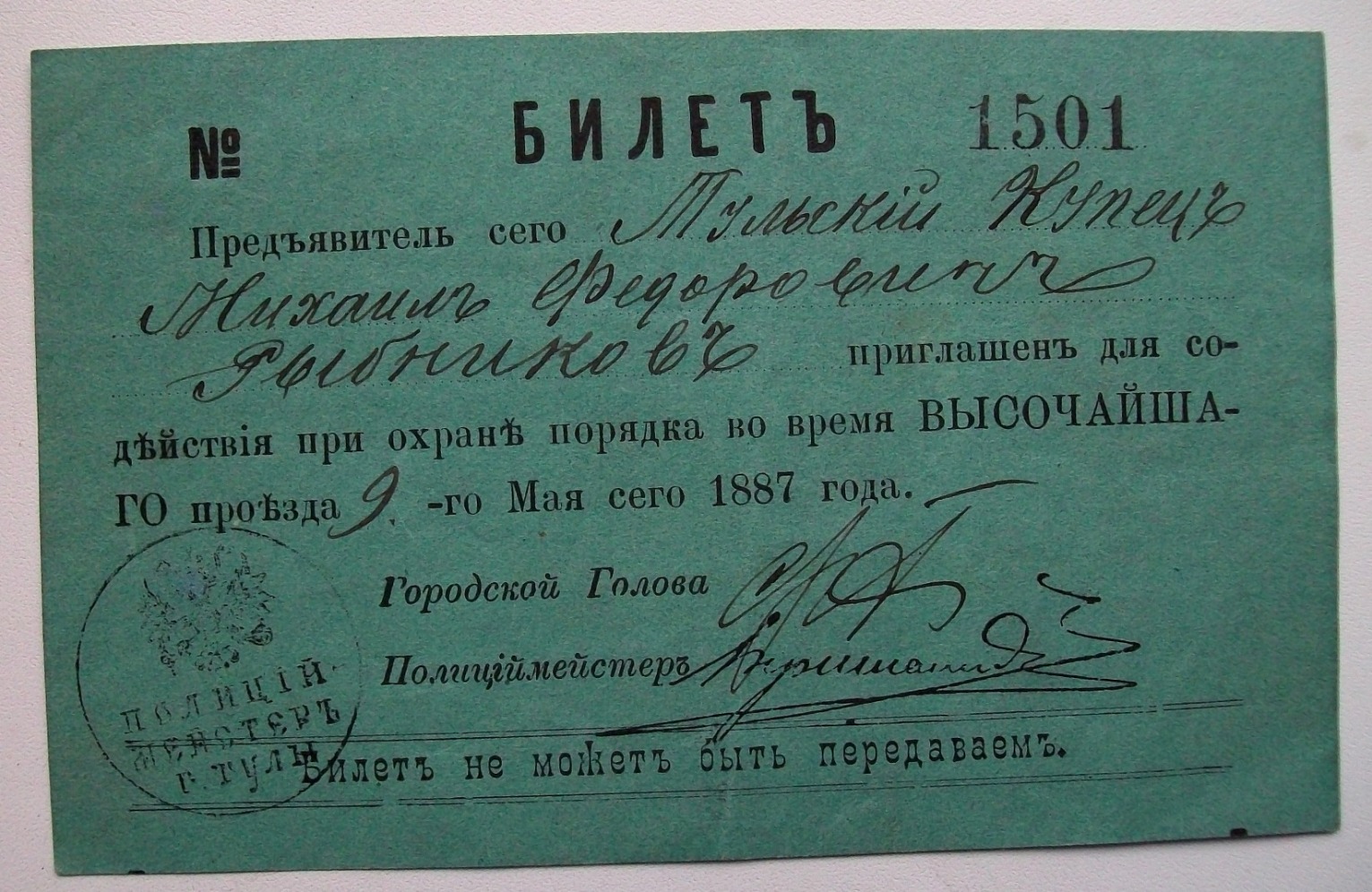 Билет для содействия порядку во время Высочайшегопр-зд.1887г RIBUS - 21 дек 2015 12:33.39 × Мини профиль пользователя RIBUS Сообщения: 2928 Зарегистрирован: 08 дек 2007 21:05.28 Статус: Не в сети - 21 дек 2015 12:33.39 #5429844 Отличное состояние!Размер 135х85 мм. Фото
