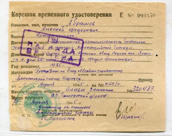 Приказом по 8-му механизированному Александрийскому корпусу от 5 апреля 1945 года красноармеец Абрамов Алексей Фёдорович награжден орденом Славы 3-й степени (№ 320487; вручен 21 апреля).