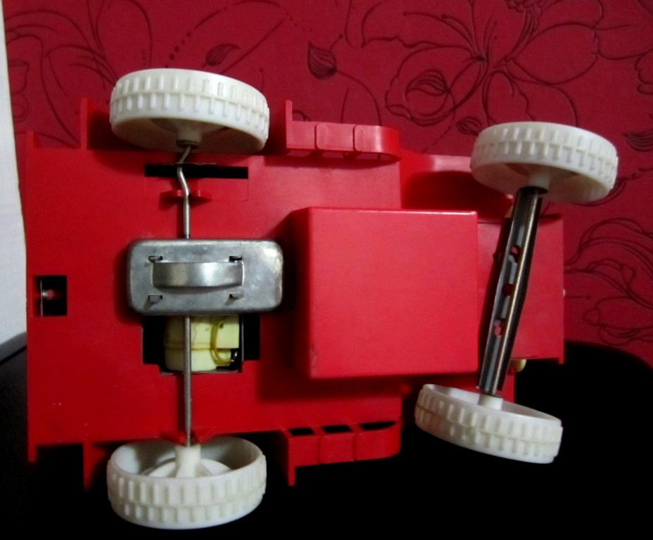 Жесть,пластик,электропривод.Проверено,на ходу (ездит назад-вперёд).