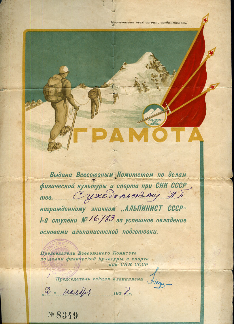 Док на знак Альпинист 1 ст. 1938 г. Состояние хорошее, небольшой порыв снизу на 6 часов.