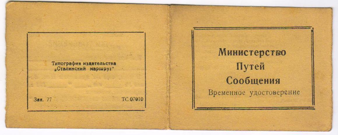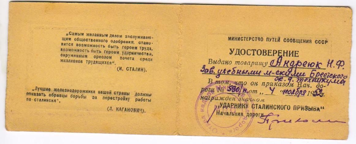 Временное удостоверение на ударника сталинского призыва.
