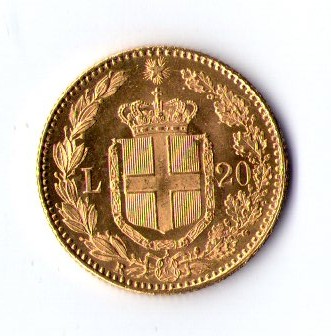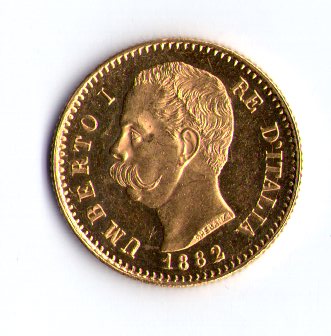 Италия 20 лир 1882 год Умберто I. Золото 6.45 гр 900 пр.