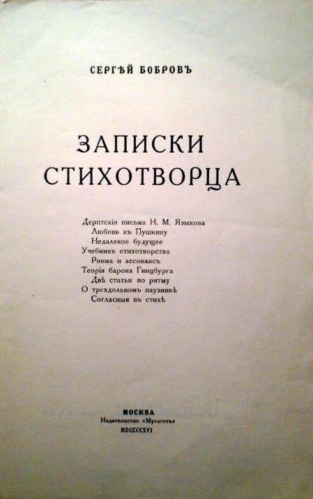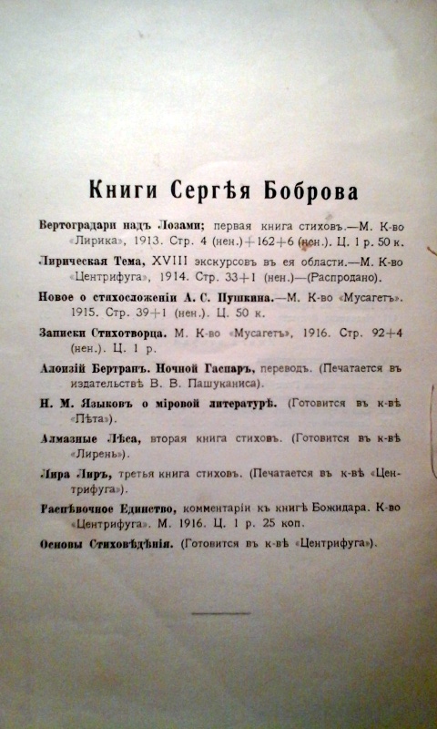 Бобров С. Записки стихотворца. М.: Мусагет, 1916. 92, 4 н.с. 23,5х16 см, хорошее состояние.
