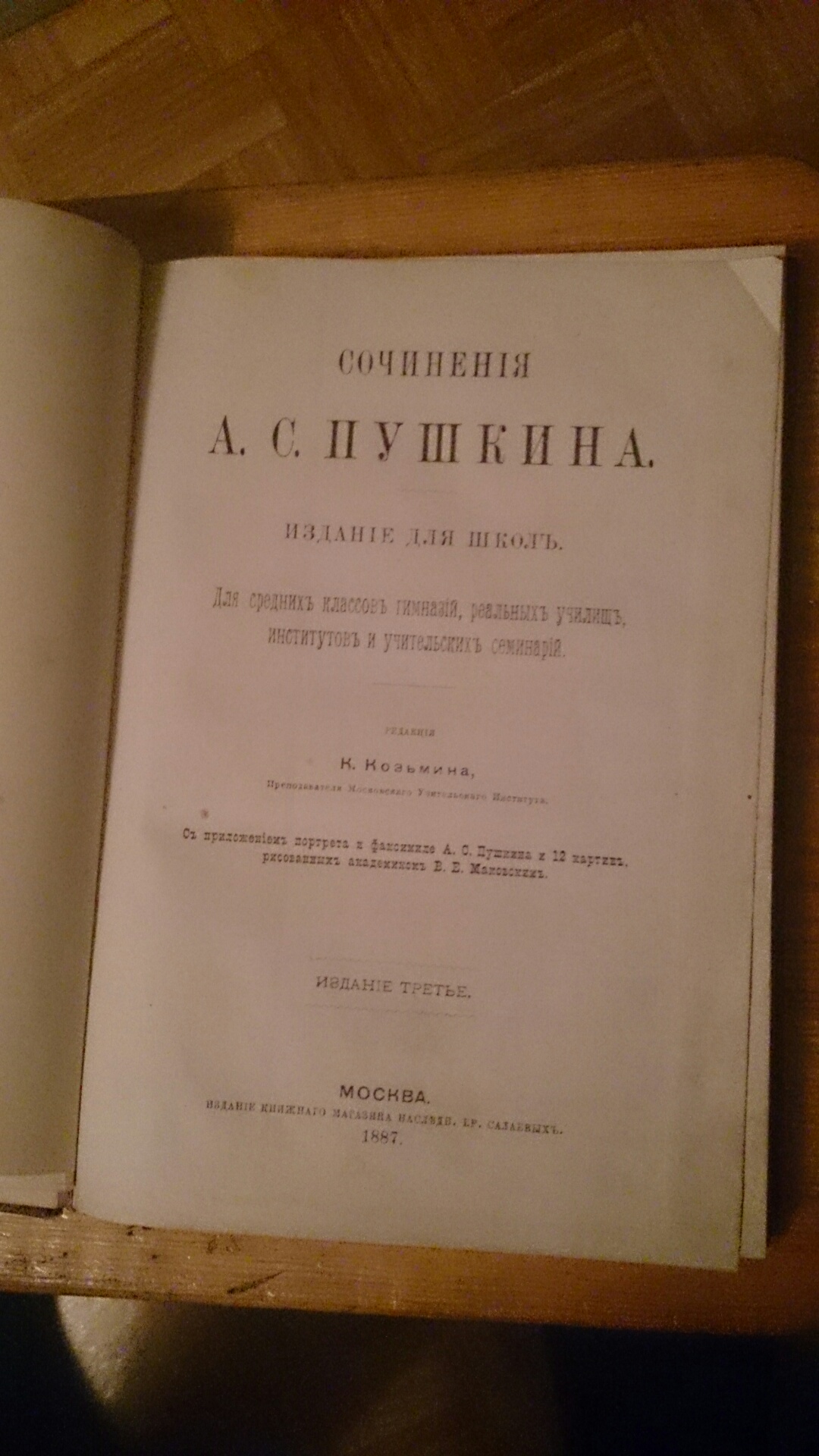 Продам. Сочинения А.С.Пушкина. Издания для школ. Редакция К.Козьмина С приложением портрета и факсимиле А.С. Пушкина и 12 картин,рисованных академиком В.Е. Маковским Издание третье Москва 1887г 252 стр. Состояние отличное. bavava@mail.ru