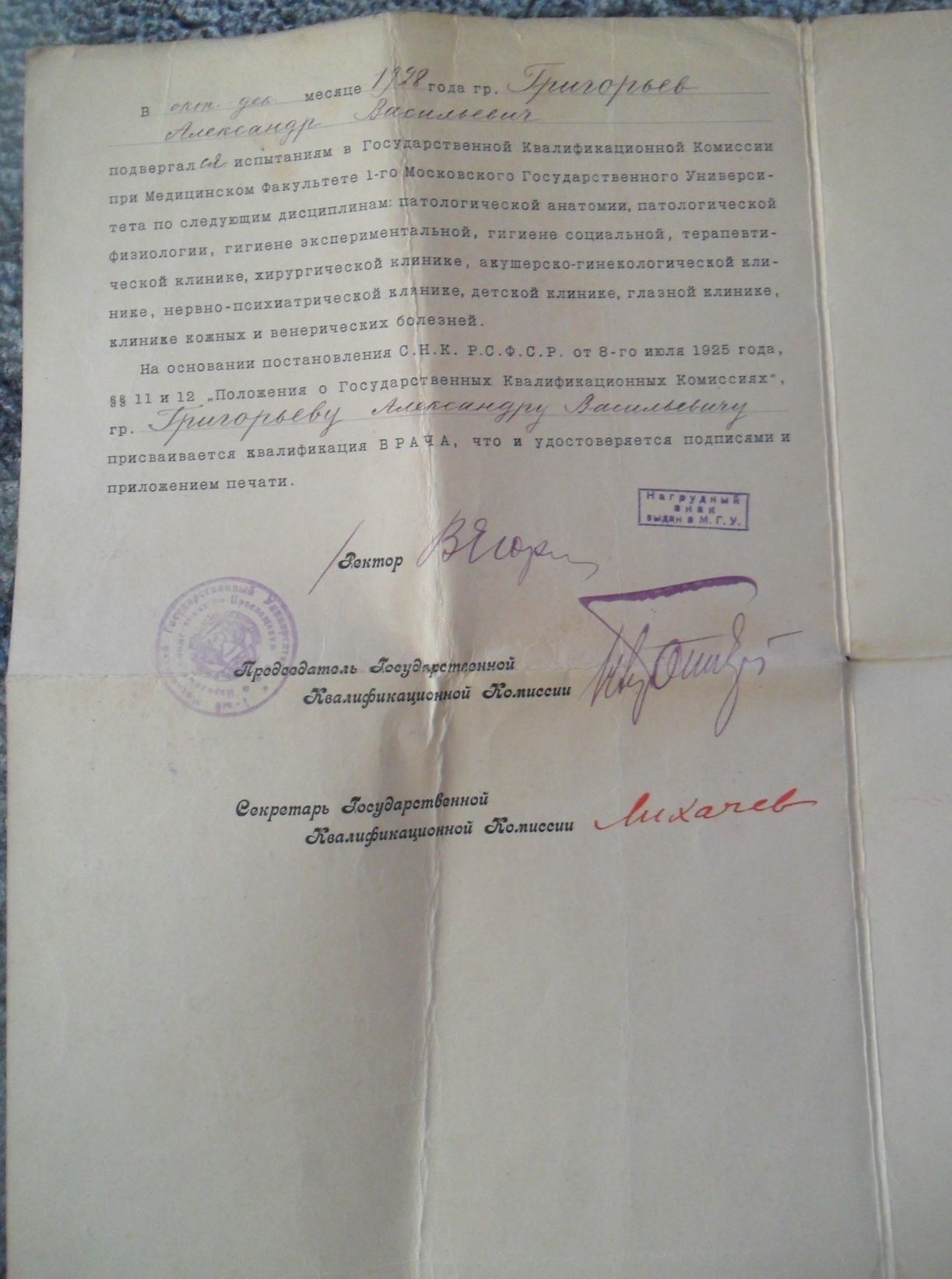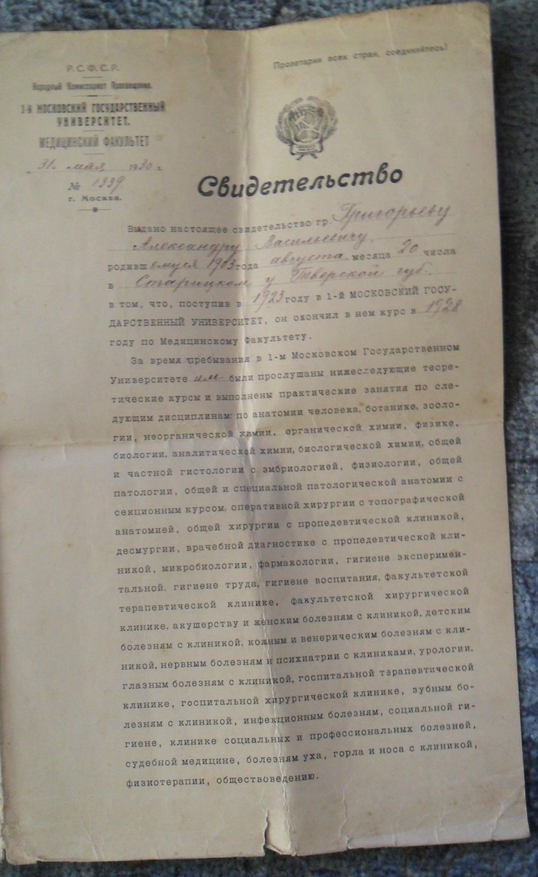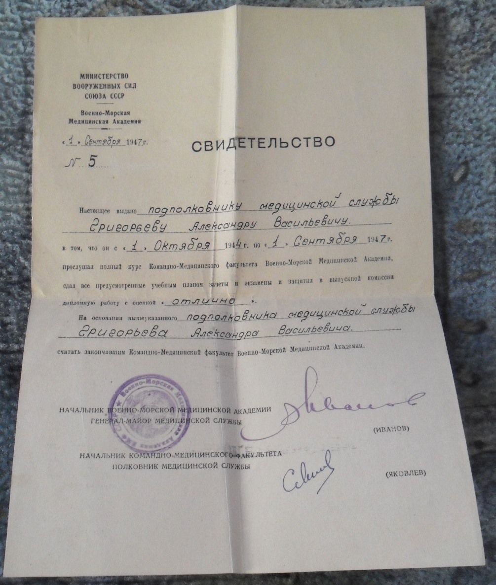 Свидетельства об окончании МГУ 1930г.и ВМА им.Кирова 1947г. Константин Д. - 03 фев 2016 12:59.07 × Мини профиль пользователя Константин Д. Сообщения: 2519 Зарегистрирован: 02 окт 2008 23:18.06 Статус: Не в сети - 03 фев 2016 12:59.07 #5503110 Состояние на фото, есть незначительные надрывы бумаги. Отправка по всему миру 3 евро. Лот находится в ЕС. Фото