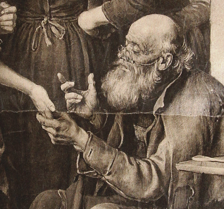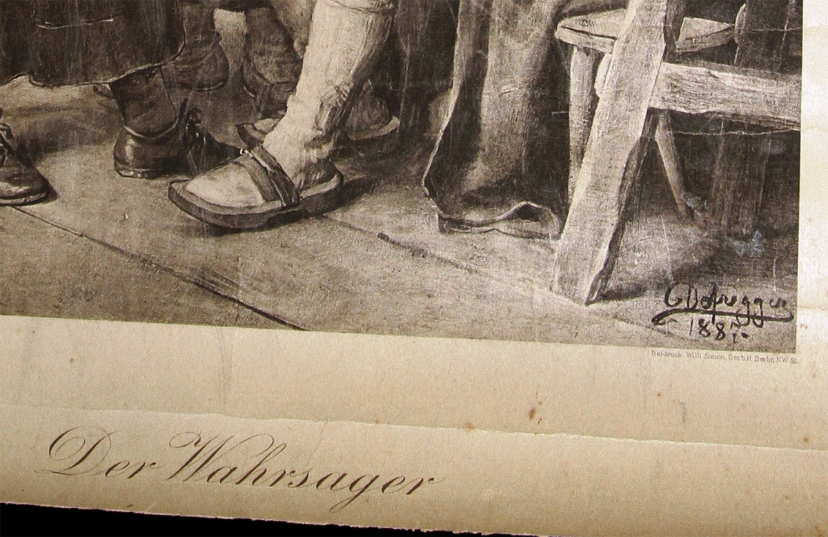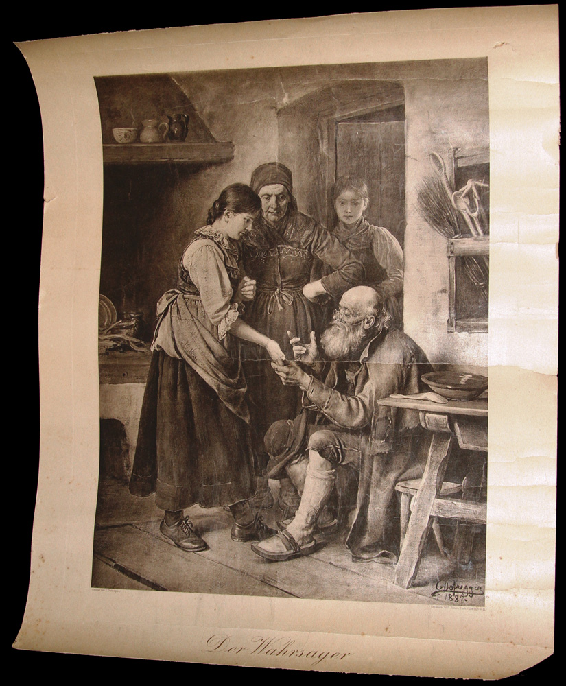 Литогравюра ФРАНЦА ДЕФРЕГГЕРА (C.DEFREGGER) "ГАДАЛКА". Франц фон Дефре́ггер (нем. Franz von Defregger, 30 апреля 1835, Эдерхоф близ Штронаха, Восточный Тироль — 2 января 1921, Мюнхен) — австрийский художник жанровой и исторической живописи. • Сын тирольского крестьянина продал в 1860 г. полученный в наследство двор, чтобы выплатить долю своим сёстрам и эмигрировать в Америку. Однако из этого ничего не получилось, и он отправился в Инсбрук на учёбу у скульптора и профессора инсбрукской школы ремёсел Михаэля Штольца. • Осенью 1860 г. Франц Дефреггер был представлен в Мюнхене Карлу Теодору фон Пилоти. Он посещал подготовительный класс Королевской школы художественных промыслов с преподавателем Германом Диком. 19 июля 1861 г. он выдержал вступительный экзамен мюнхенской Академии художеств. Там он обучался в классе живописи у ученика Корнелиуса Германа Аншюца. • За Мюнхеном последовал Париж, где он самостоятельно занимался рисунком человеческого тела и основательно изучил музеи, художественные коллекции и мастерские. • 8 июля 1865 г. Дефреггер вернулся в Мюнхен и работал над своими эскизами. В 1867—1870 гг. вместе с Гансом Макартом и Габриэлем Максом он работал в мастерской Пилоти. Его работы быстро завоевали успех у публики. В 1878—1910 гг. он получил в мюнхенской академии титул профессора исторической живописи в классе композиции. Учеником Дефреггера был Ловис Коринт. Дефреггеру особенно нравился портрет, работы на темы крестьянского быта, а также драматические сцены борьбы Тироля за свободу 1809 г. • В 1883 г. Дефреггеру было присвоено дворянское звание и ещё при жизни был награждён многочисленными призами и наградами. Одним из его учеников был Хуго Энгель. Дефреггер делил мастерскую с другими художниками-приверженцами мюнхенской школы искусства, например, с Рудольфом Эппом. • Франц фон Дефреггер умер 2 января 1921 г. в возрасте 85 лет. Он похоронен в семейном склепе на мюнхенском кладбище Нордфридхоф.