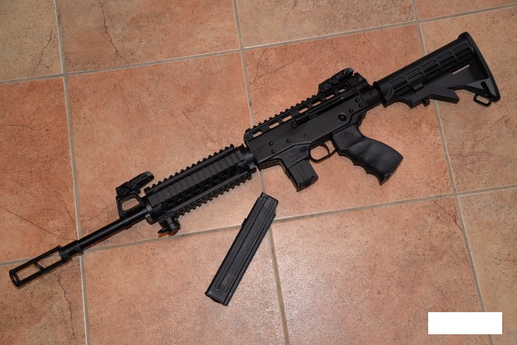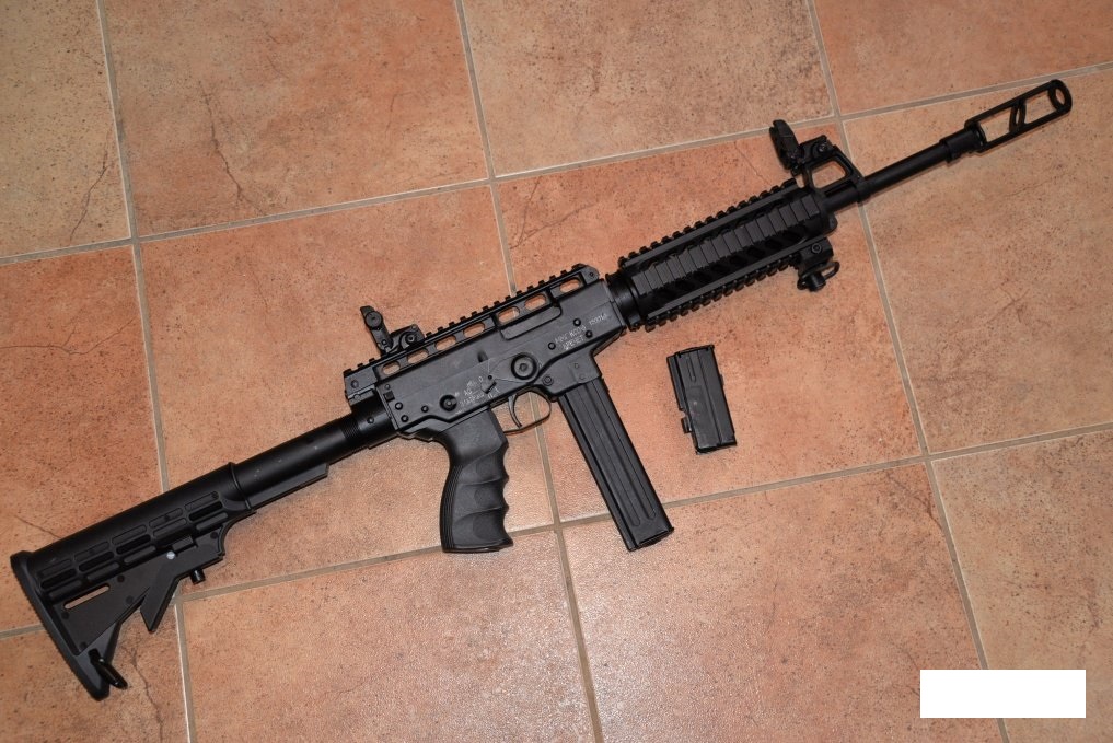 Под патрон 9Х19 Люгер. Приклад выдвигается, в комплекте два ЦЕЛЫХ магазина - на 10 и 20 патронов.