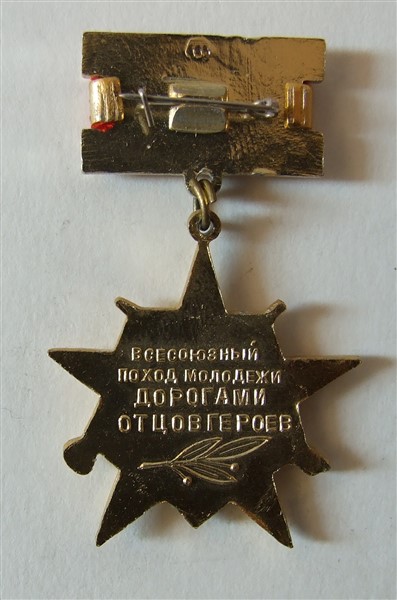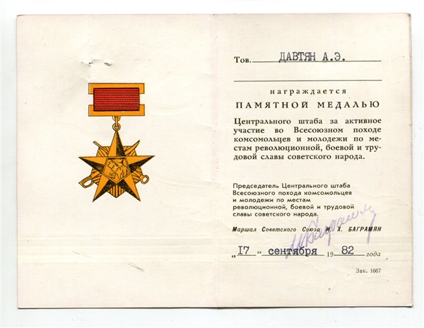 медаль ВЛКСМ за участие в походе по местам боевой славы с подписью Баграмян
