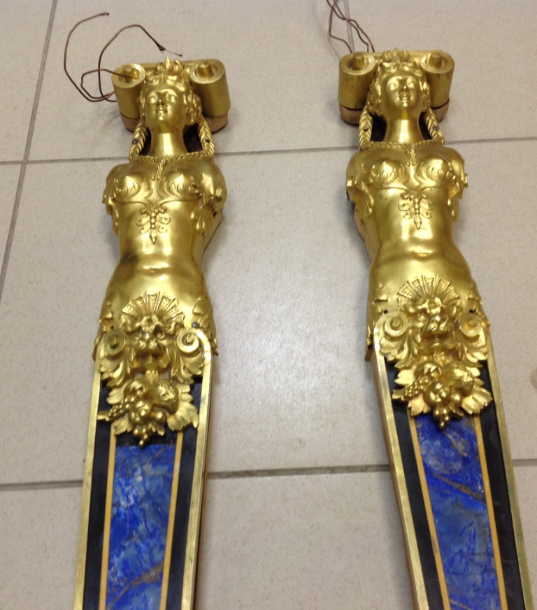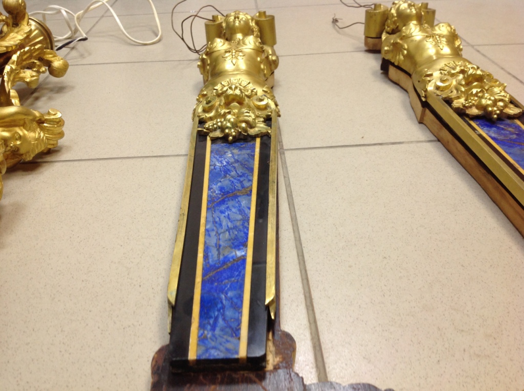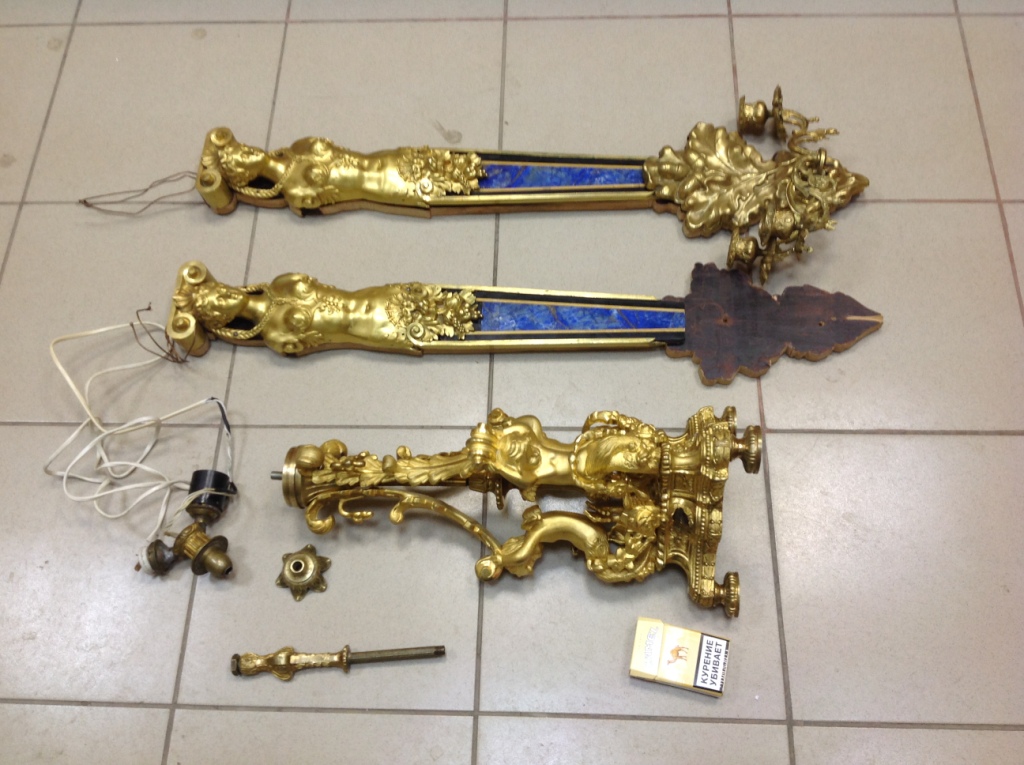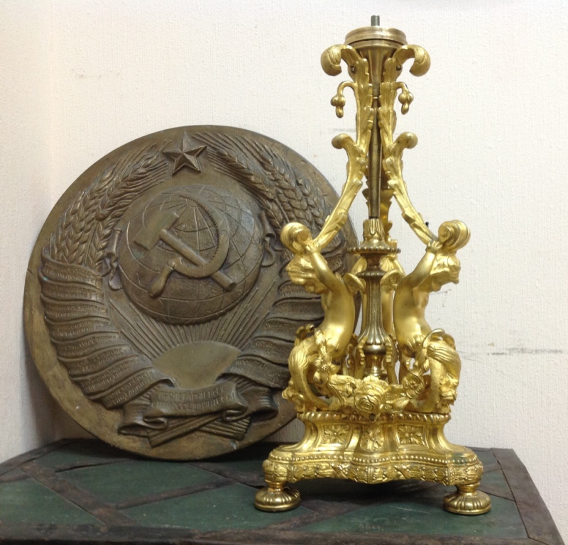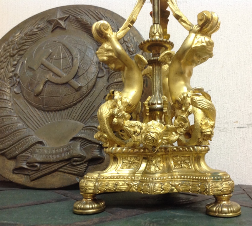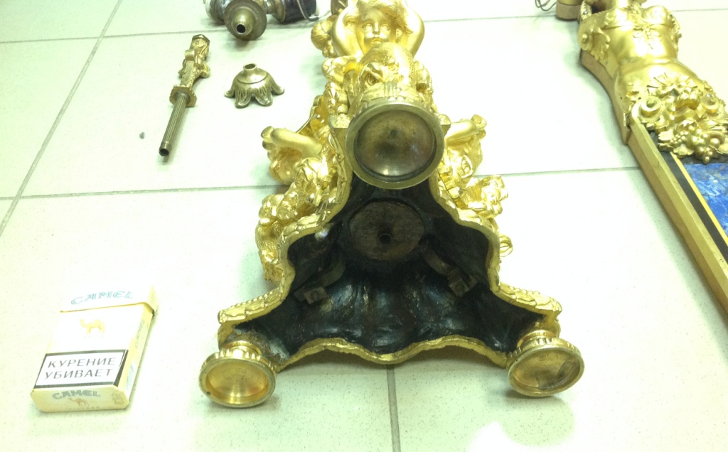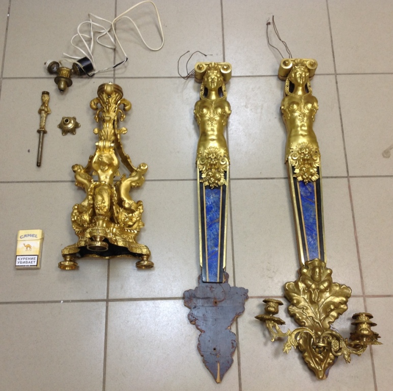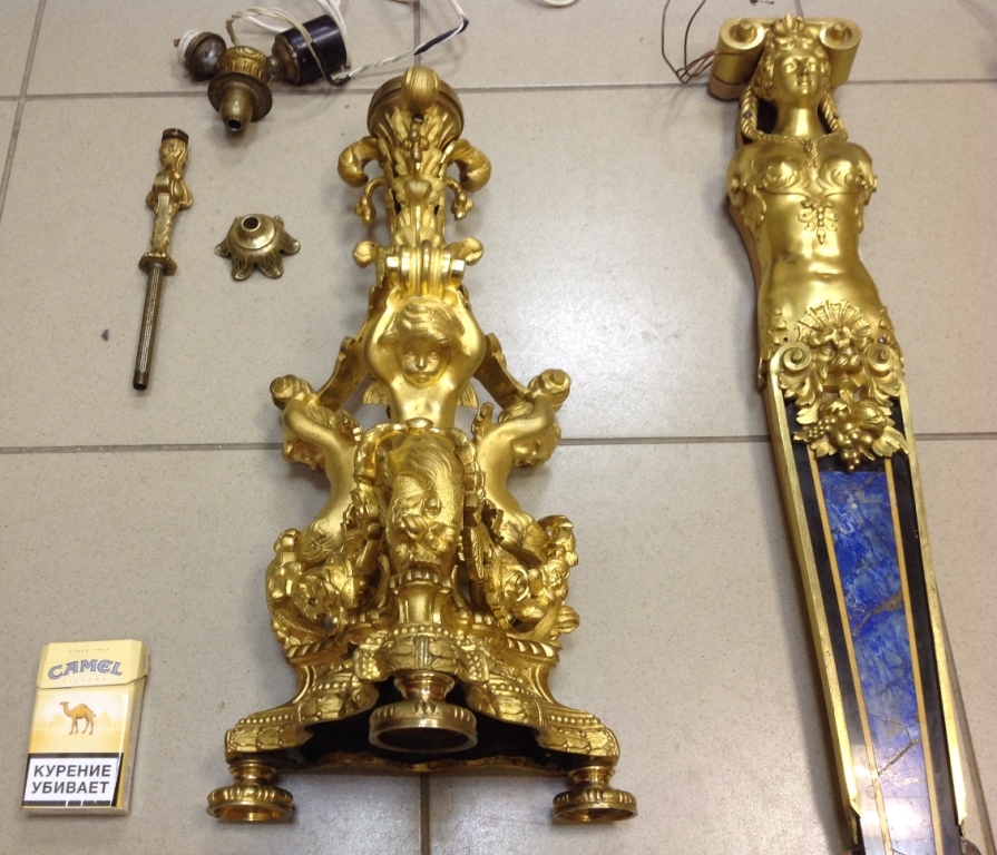 Лампа громадная -высота 49 см.Вес около 11 кг. Но надо делать электрику-и абажур подбирать..И 2 фигуры золоченых...закреплены на толстой фанере..Что то видимо выдумывали -изобретали..На одной зачем то канделябр приделали...Синий -это камень...по крайней мере очень похоже...Оникс? Высота конструкции фигур 82 см. Может кто знает-для чего эти фигуры? И может ли это хозяйство заинтересовать кого нибудь? Короче...предложите кому надо по РФ!