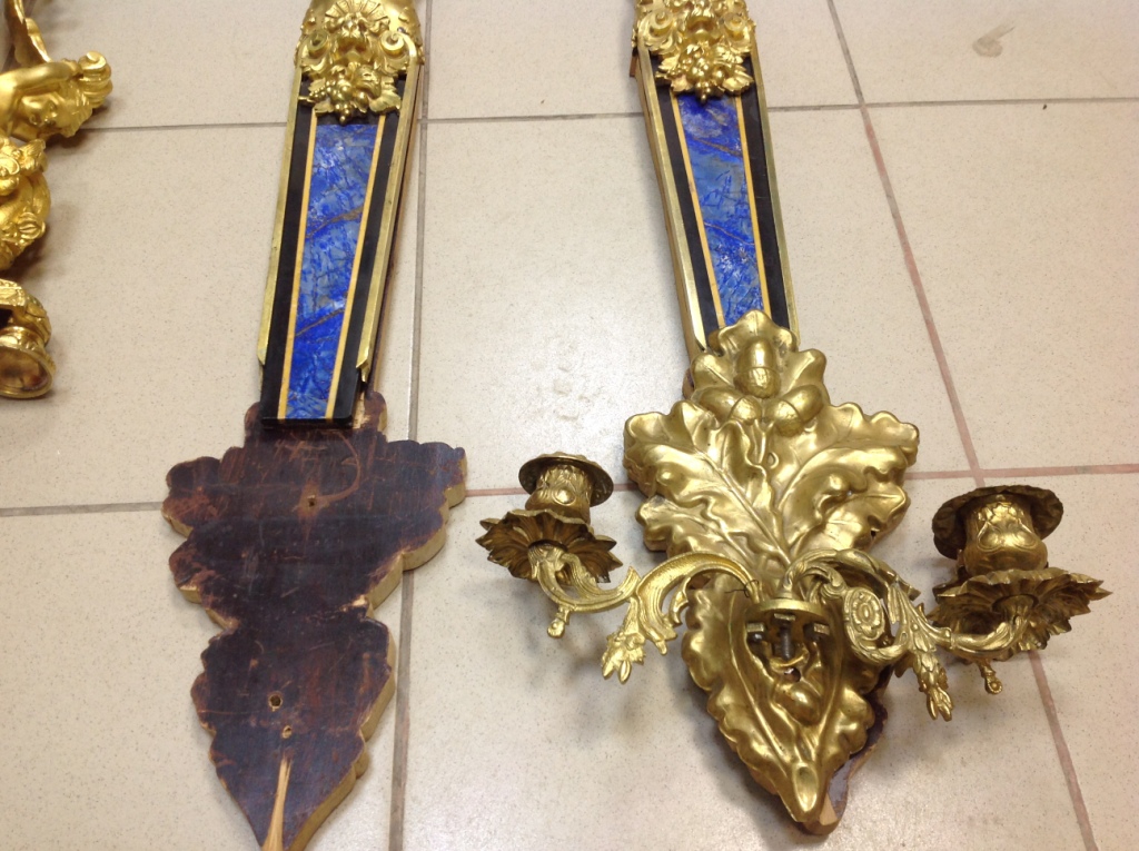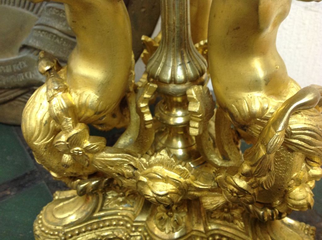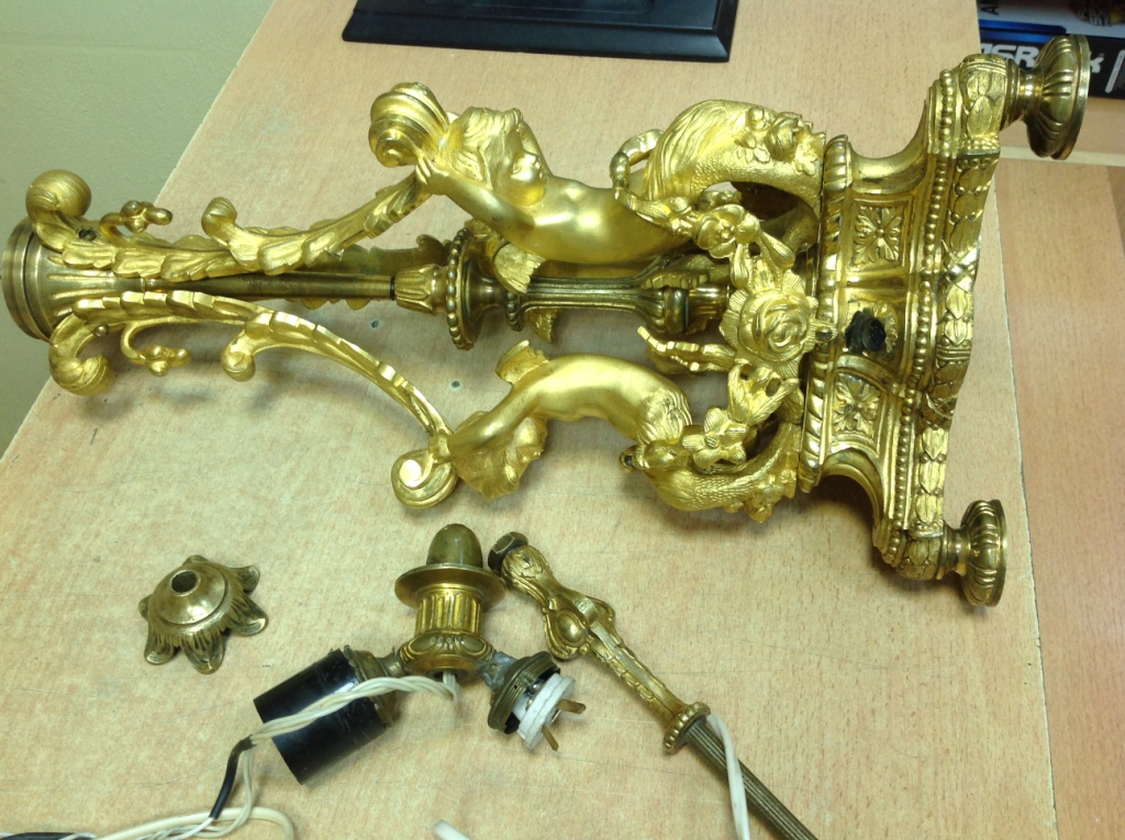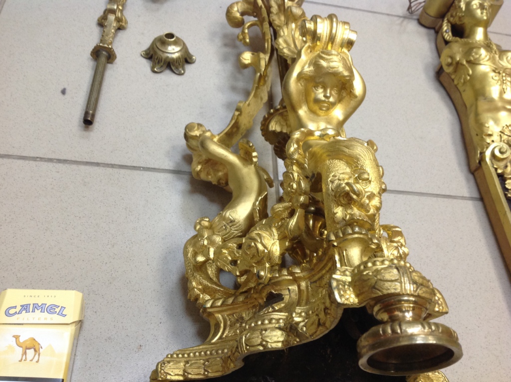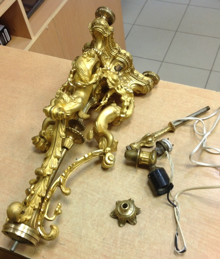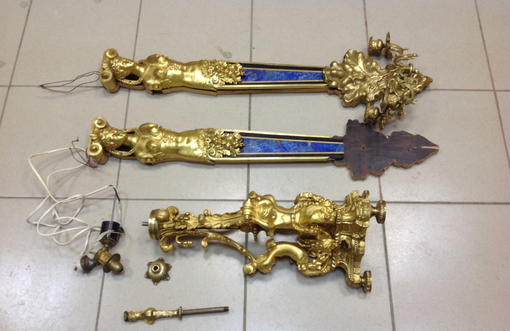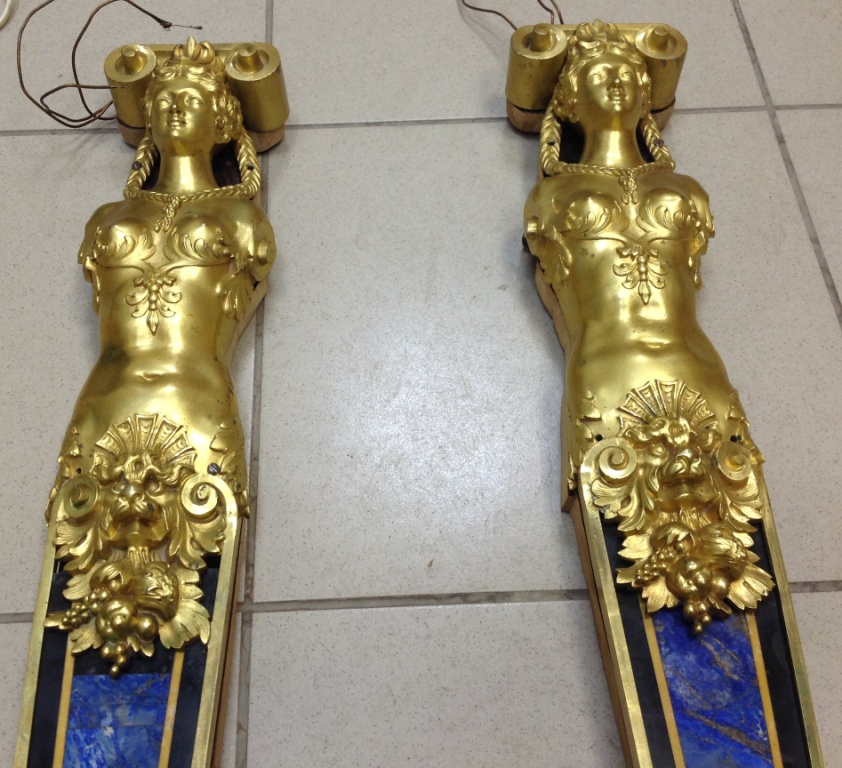Лампа громадная -высота 49 см.Вес около 11 кг. Но надо делать электрику-и абажур подбирать..И 2 фигуры золоченых...закреплены на толстой фанере..Что то видимо выдумывали -изобретали..На одной зачем то канделябр приделали...Синий -это камень...по крайней мере очень похоже...Оникс? Высота конструкции фигур 82 см. Может кто знает-для чего эти фигуры? И может ли это хозяйство заинтересовать кого нибудь? Короче...предложите кому надо по РФ!