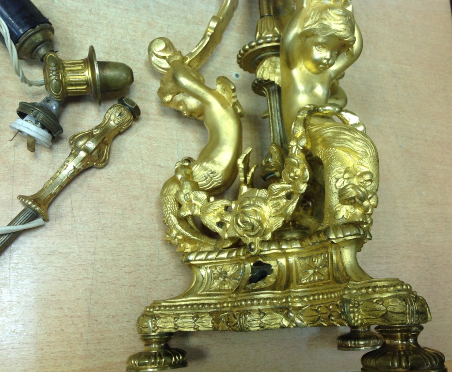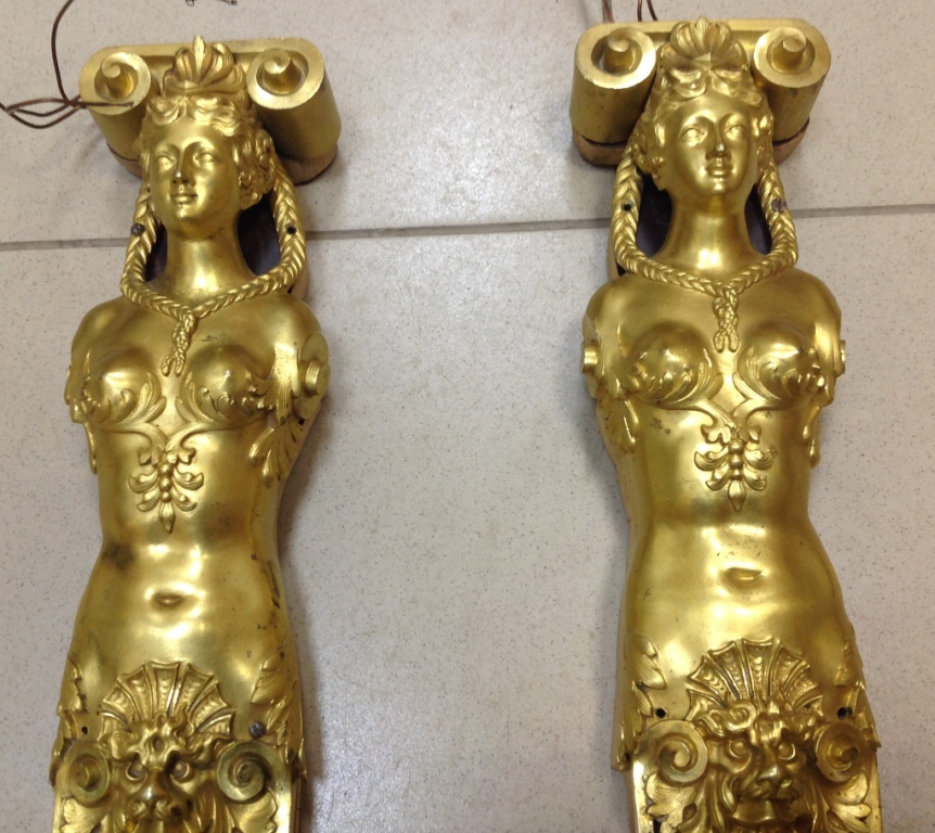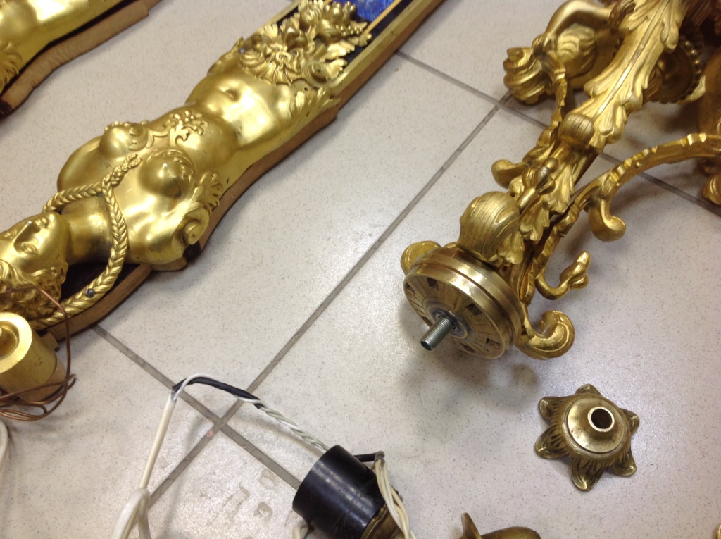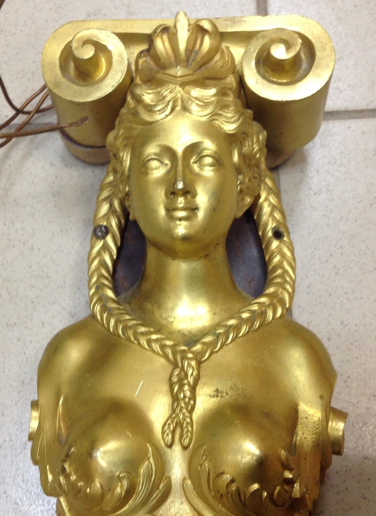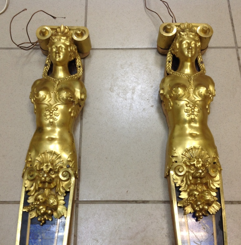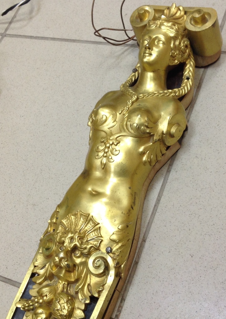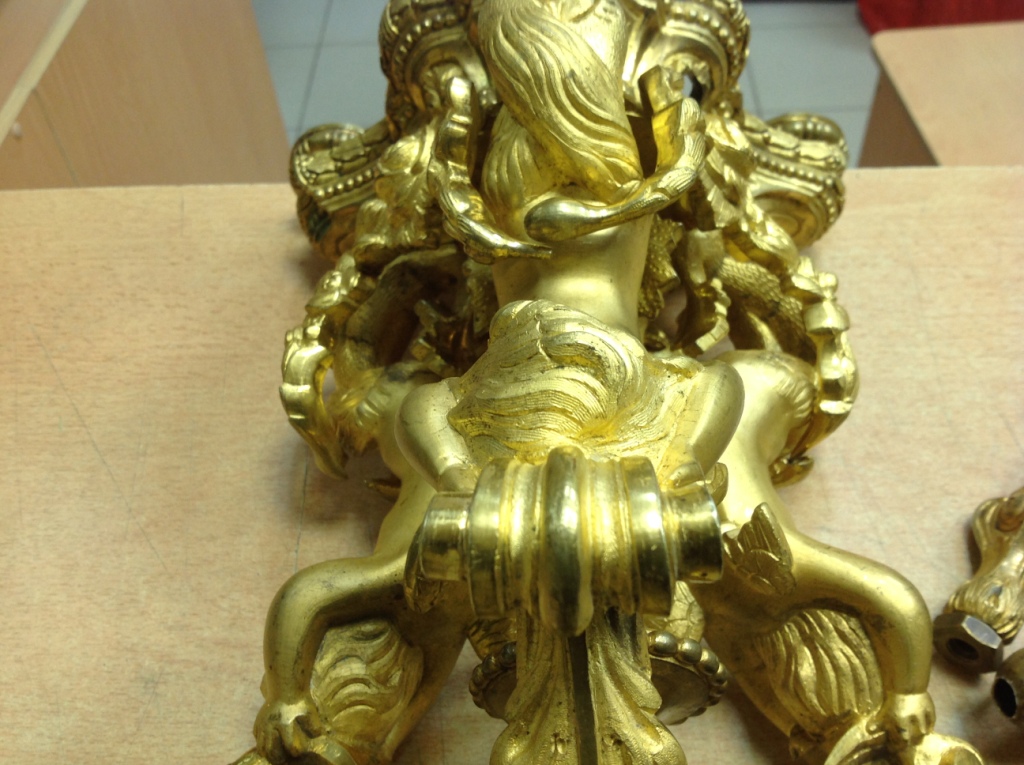 Лампа громадная -высота 49 см.Вес около 11 кг. Но надо делать электрику-и абажур подбирать..И 2 фигуры золоченых...закреплены на толстой фанере..Что то видимо выдумывали -изобретали..На одной зачем то канделябр приделали...Синий -это камень...по крайней мере очень похоже...Оникс? Высота конструкции фигур 82 см. Может кто знает-для чего эти фигуры? И может ли это хозяйство заинтересовать кого нибудь? Короче...предложите кому надо по РФ!